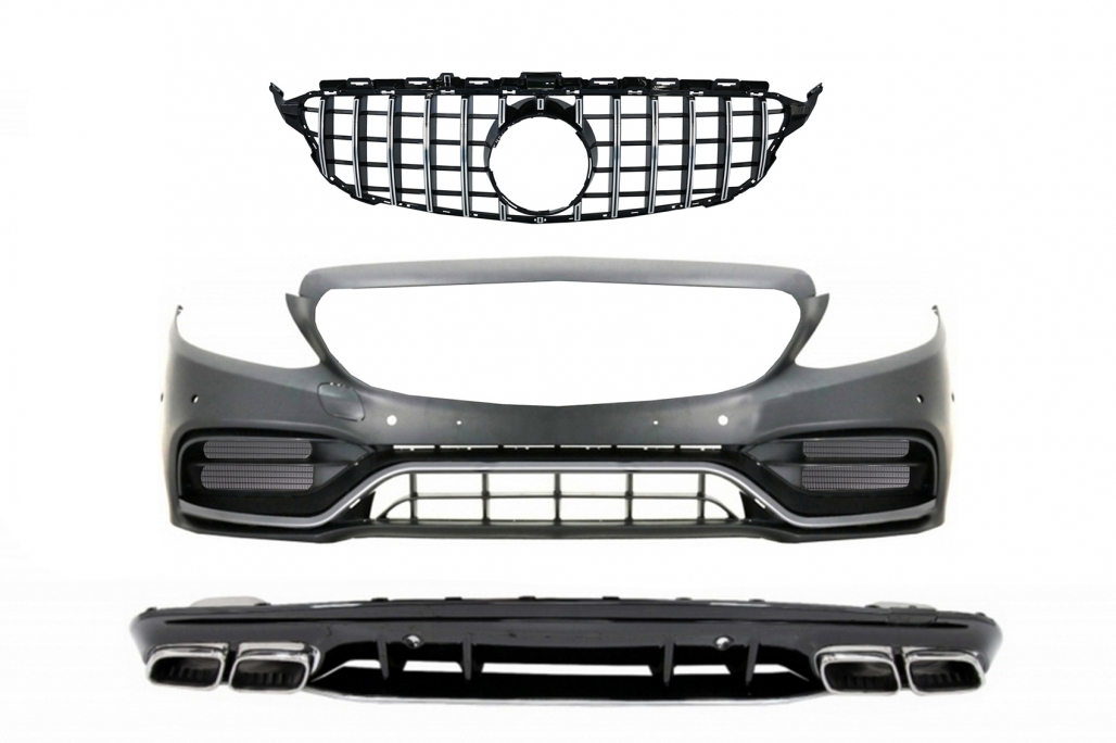 Bara Fata Completa cu Difuzor si Ornamente Evacuare compatibil cu Mercedes C-Class W205 S205 AMG Sport Line (2014-2020) C63S Design