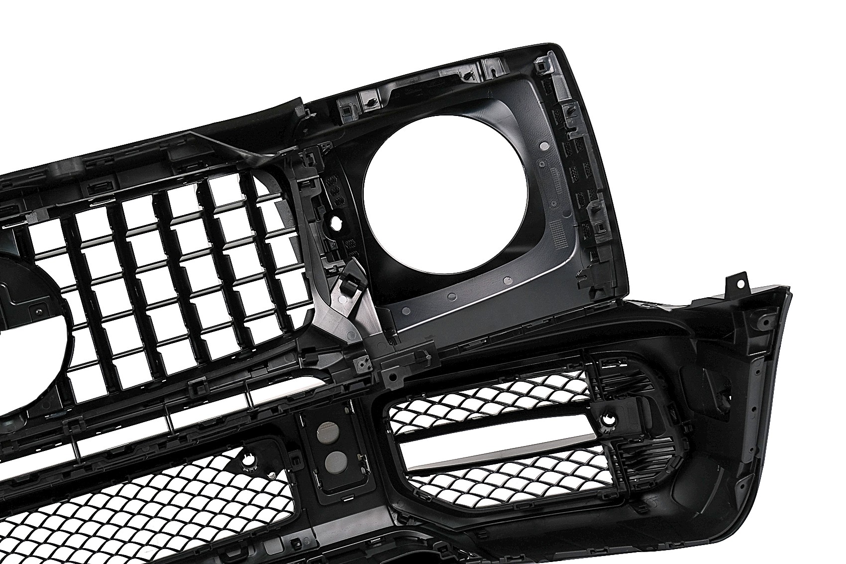 Bara Fata echipata cu ranforsare metalica, grile laterale, ornamente aluminiu si suportul numarului de inmatriculare. Grila centrala Grila este fabricata din plastic de cea mai buna calitate Prelungiri aripi Prelungirile sunt fabricate din Polipropilena flexibila de cea mai buna calitate. Extensiile nu sunt vopsite.