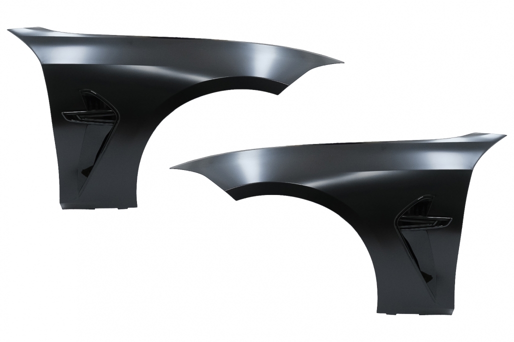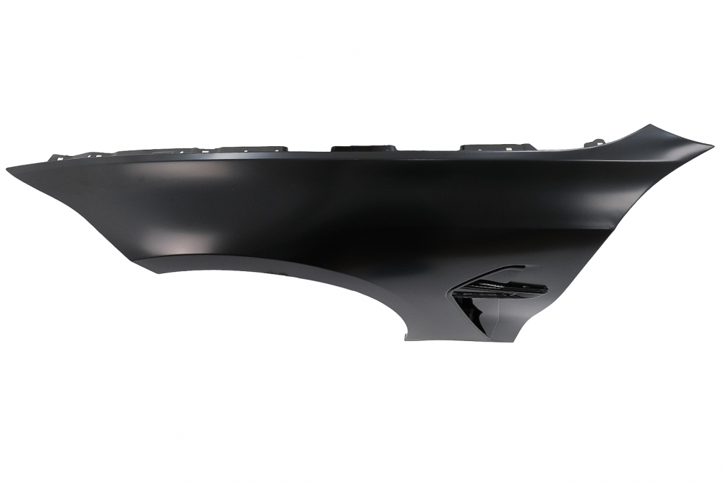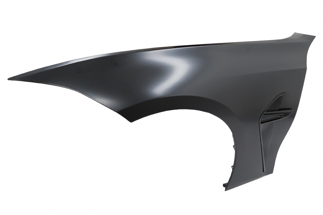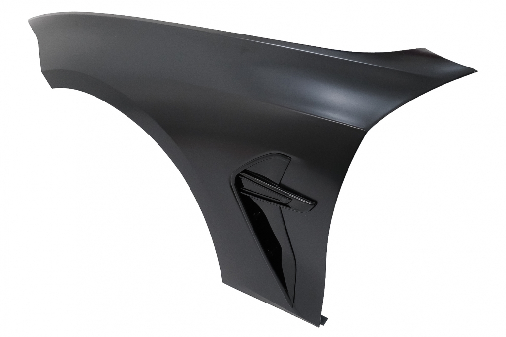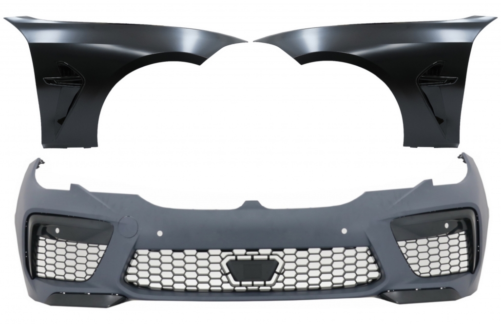 Bara fata este echipata cu grila centrala, grilele laterale, capacul de remorcare si deschiderea pentru distronic din grila centrala si sunt vopsite in culoarea negru lucios. Bara nu este echipata cu capacelele pentru sistemul de spalare a farurilor. Fabricata din polipropilena de cea mai buna calitate si este pregatita pentru procesul de vopsire. Aripi Laterale Negru M8 Design Aripile sunt fabricate din otel de cea mai buna calitate. Aripi Laterale ehipate cu sistem de ventilare. Emblema nu este inclusa.