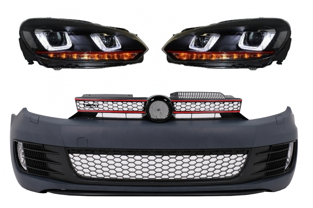 Ofera masinii tale un aspect sportiv si modern cu acest kit bara fata VW Golf 6 GTI Look, completat de faruri LED U Design cu strip rosu si semnal dinamic. Pachetul este conceput pentru a imbunatati estetica frontala a masinii si pentru a aduce un plus de vizibilitate si stil, pastrand o integrare foarte buna pe modelele compatibile.