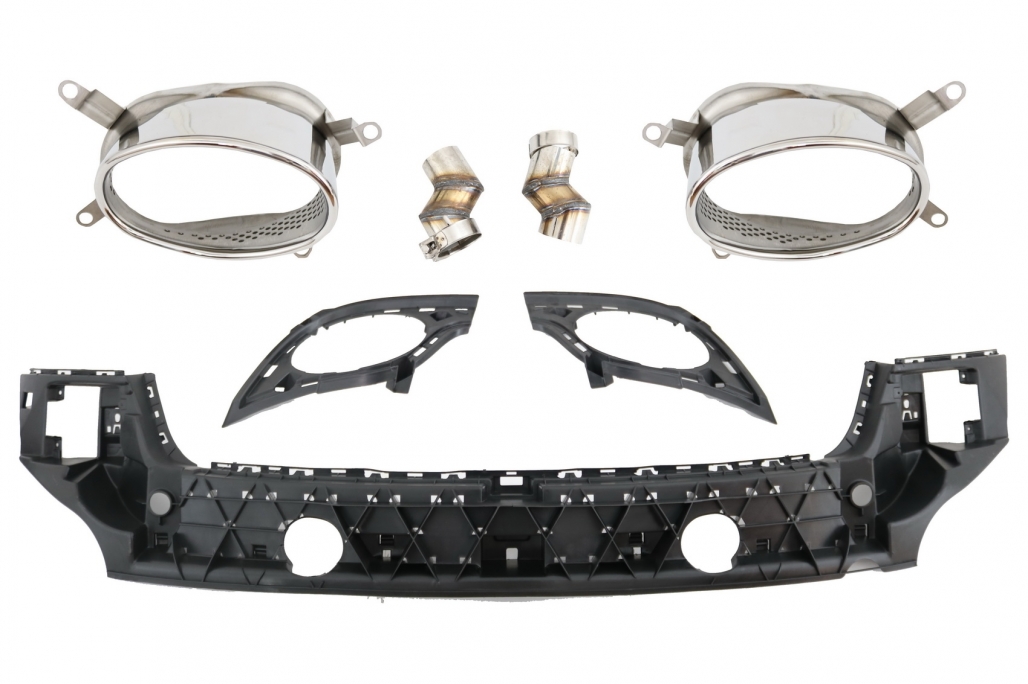 Fabricata din polipropilena de inalta calitate, bara este rezistenta si pregatita pentru procesul de vopsire. Pachetul include difuzor de aer dublu, ornamente pentru evacuare si accesorii de montaj pentru sistemul de evacuare, fiind o alegere foarte buna pentru un upgrade exterior cu look dinamic.
