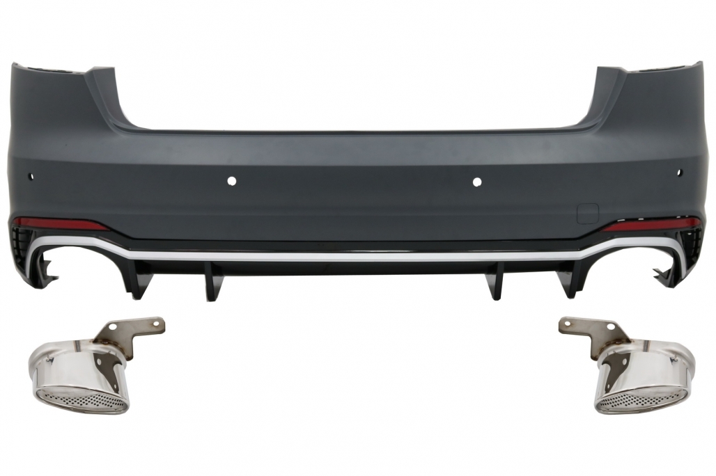 Bara Spate RS4 Design Bara este fabricata din plastic PP (polipropilena) de cea mai buna calitate, este pregatita pentru procesul de vopsire. Bara spate este echipata cu difuzor de aer detasabil cu evacuare dubla, disponibila cu suporti pentru senzorii de parcare (PDC)