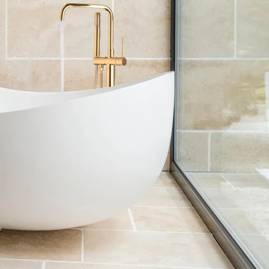 Transformă baia într-un spațiu elegant cu această baterie de podea pentru cadă, realizată din alamă sanitară și finisată auriu lucios. Designul modern, cu linii simple, se potrivește perfect lângă o cadă freestanding și oferă un plus de confort în utilizare.