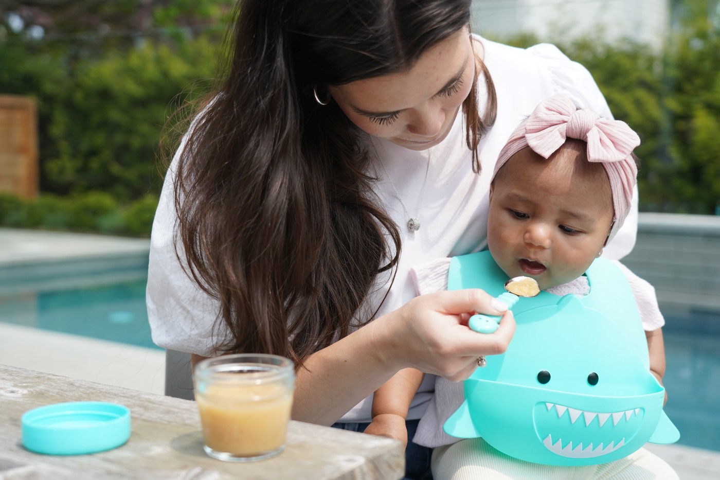 Mod de utilizare: fixați baveta în jurul gâtului folosind sistemul cu nasturi, ajustați poziția potrivită pentru copil și folosiți-o la fiecare masă sau gustare. După utilizare, clătiți rapid sau spălați-o în mașina de spălat vase.