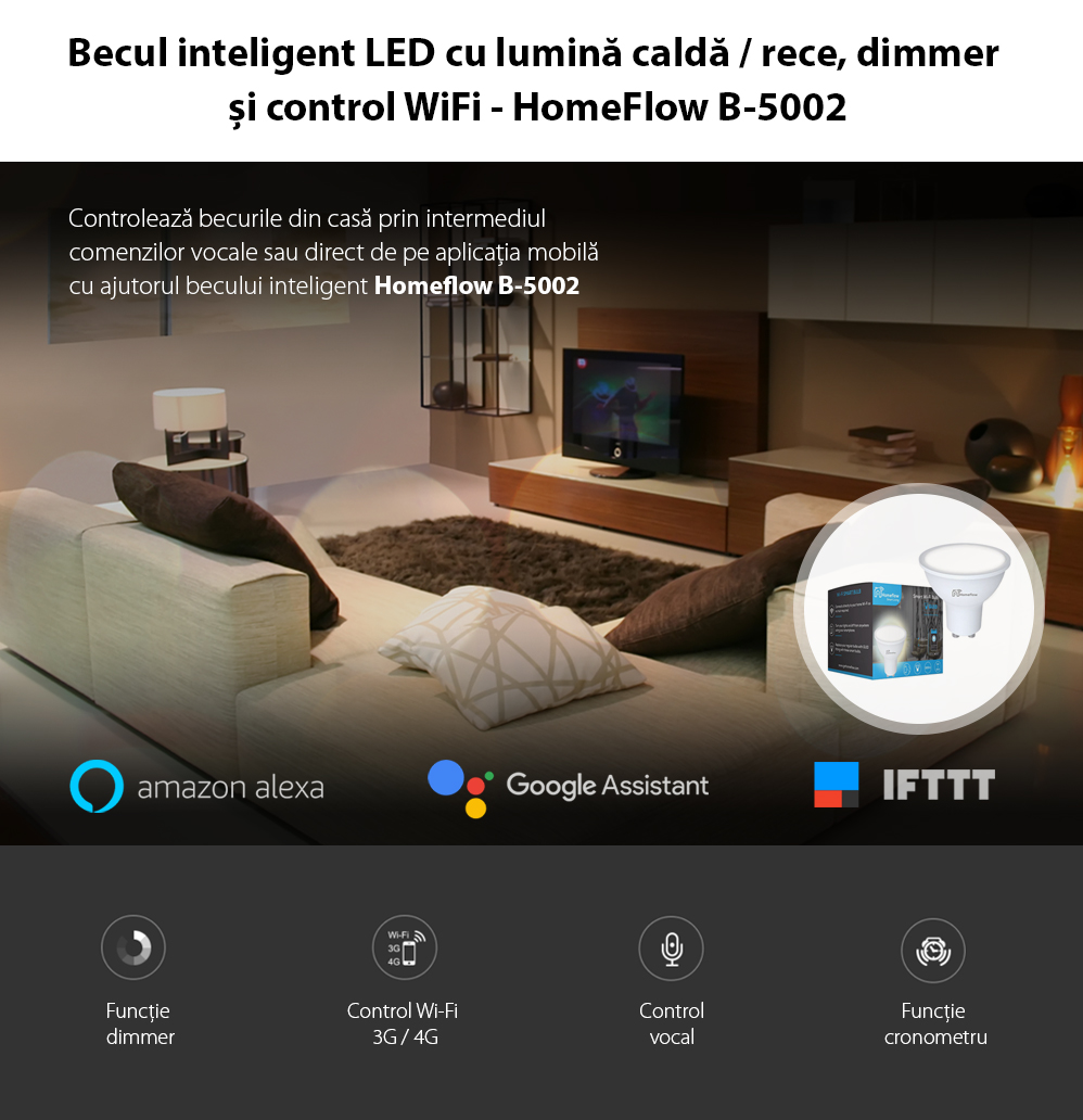 Bec inteligent LED Wireless Homeflow B-5002, GU10, 5W (35W), 300lm, dimabil, lumina calda/ rece, Control de pe telefonul mobil SmartElectro IntelligentHouse