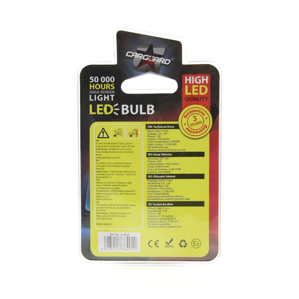 Îmbunătățește rapid iluminarea din mașină cu becul LED sofit 41mm Carguard CLD020. Oferă o lumină clară și uniformă, fiind ideal pentru plafonieră auto sau iluminarea numărului de înmatriculare (în funcție de compatibilitate).