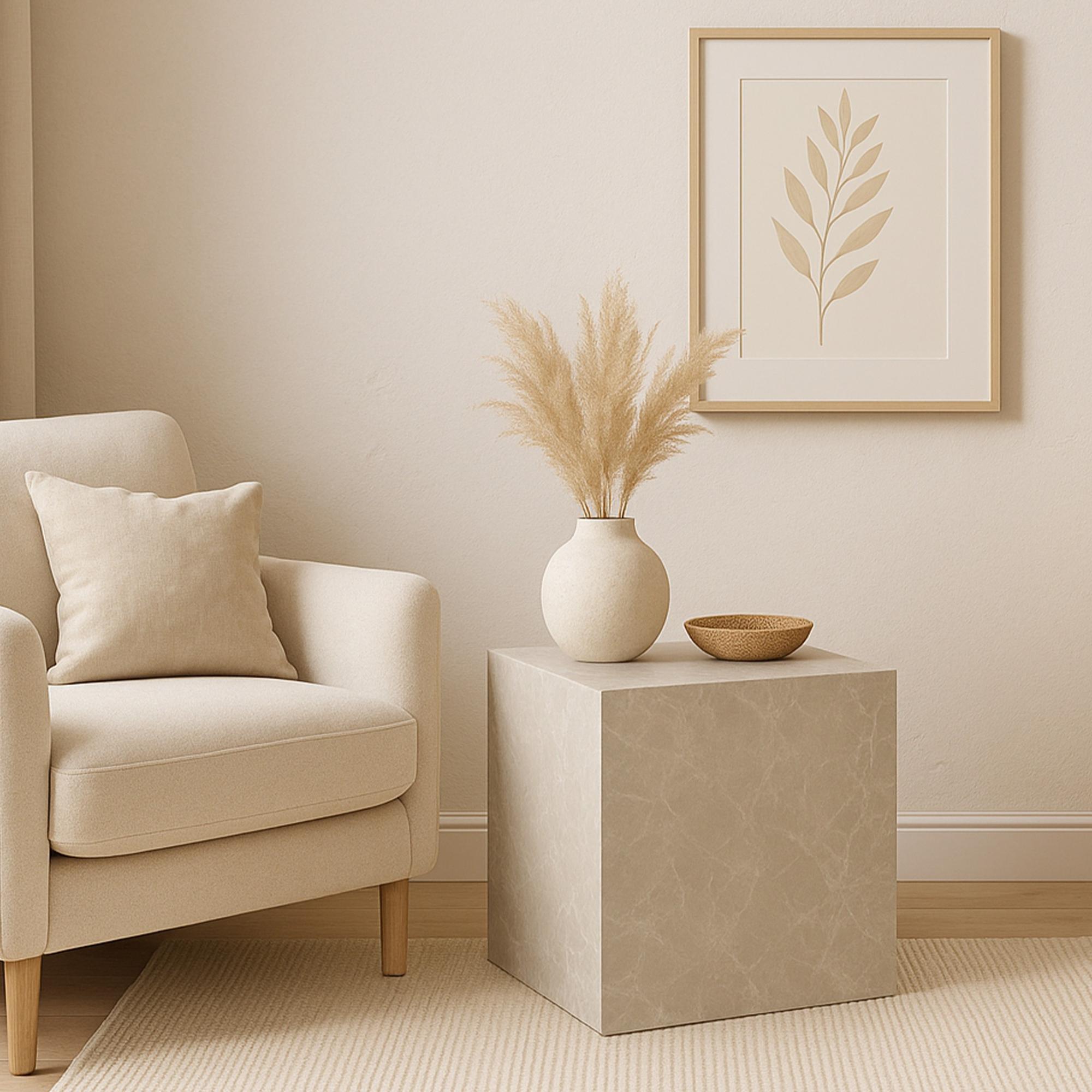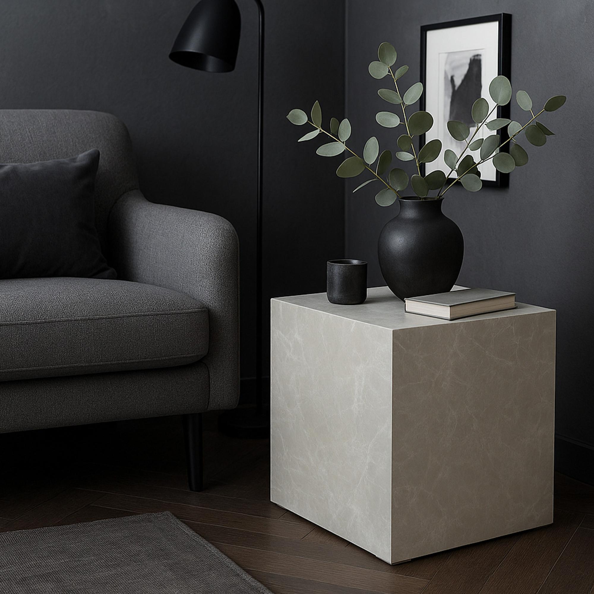 Die stabile, würfelförmige Konstruktion gewährleistet einen sicheren Stand, während die zeitlose Marmoroptik das moderne Design unterstreicht.