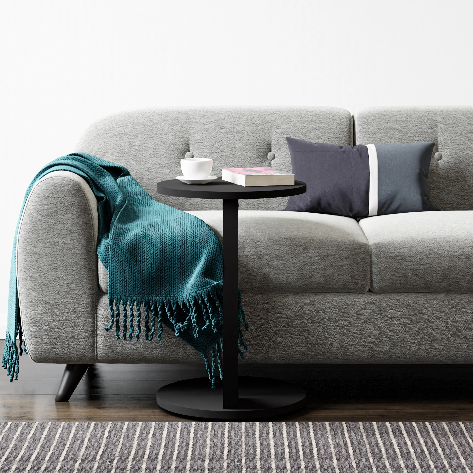 Der Tisch ist mit vier Rollen ausgestattet, die ein müheloses Verschieben ermöglichen, sodass er beliebig positioniert werden kann. Durch seine C-förmige Konstruktion kann er platzsparend unter das Sofa gleiten, was für zusätzlichen Komfort im Wohnbereich sorgt.