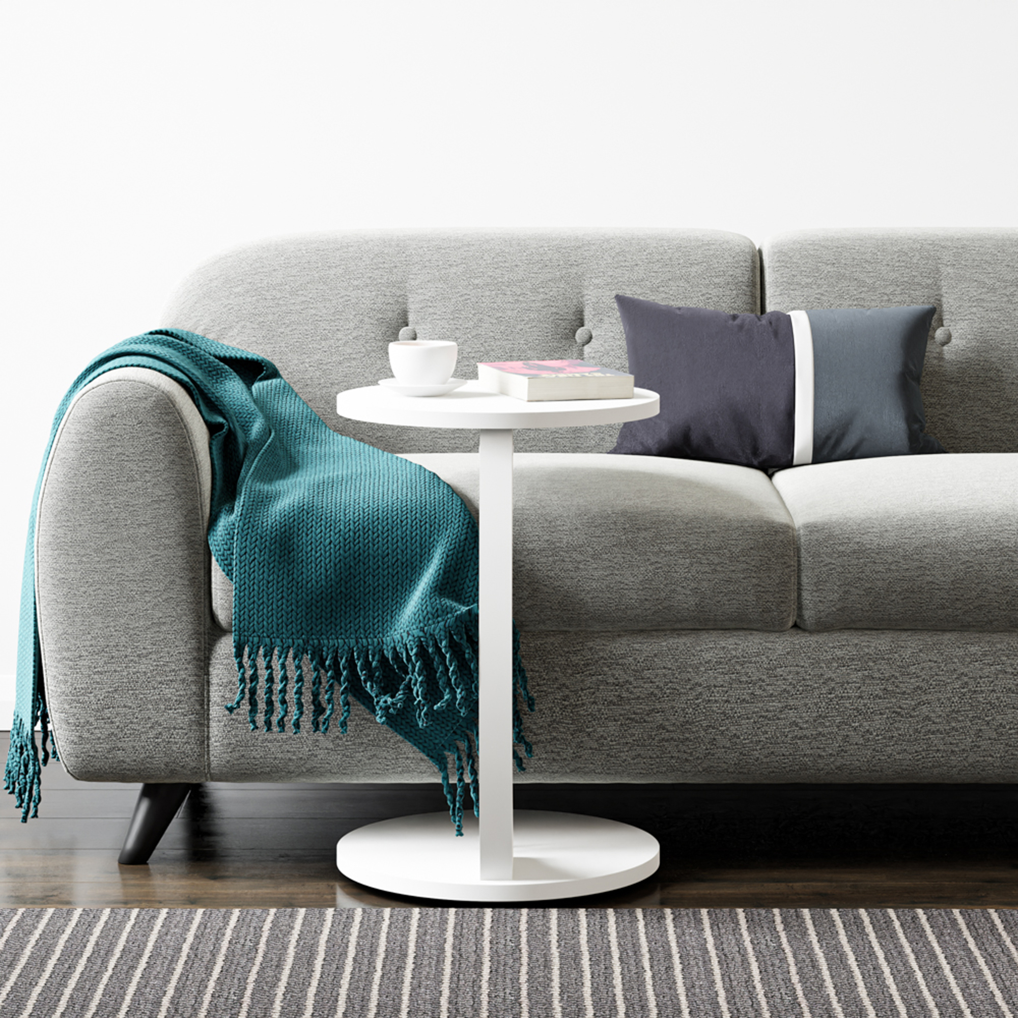 Der Tisch ist mit vier Rollen ausgestattet, die ein müheloses Verschieben ermöglichen, sodass er beliebig positioniert werden kann. Durch seine C-förmige Konstruktion kann er platzsparend unter das Sofa gleiten, was für zusätzlichen Komfort im Wohnbereich sorgt.