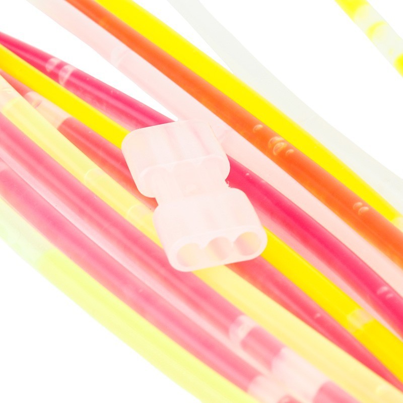 Cum se folosesc: indoaie betisorul pe toata lungimea pana auzi sunetul de activare, agita usor pentru a omogeniza lumina, apoi fixeaza-l cu un conector pentru a forma o bratara.