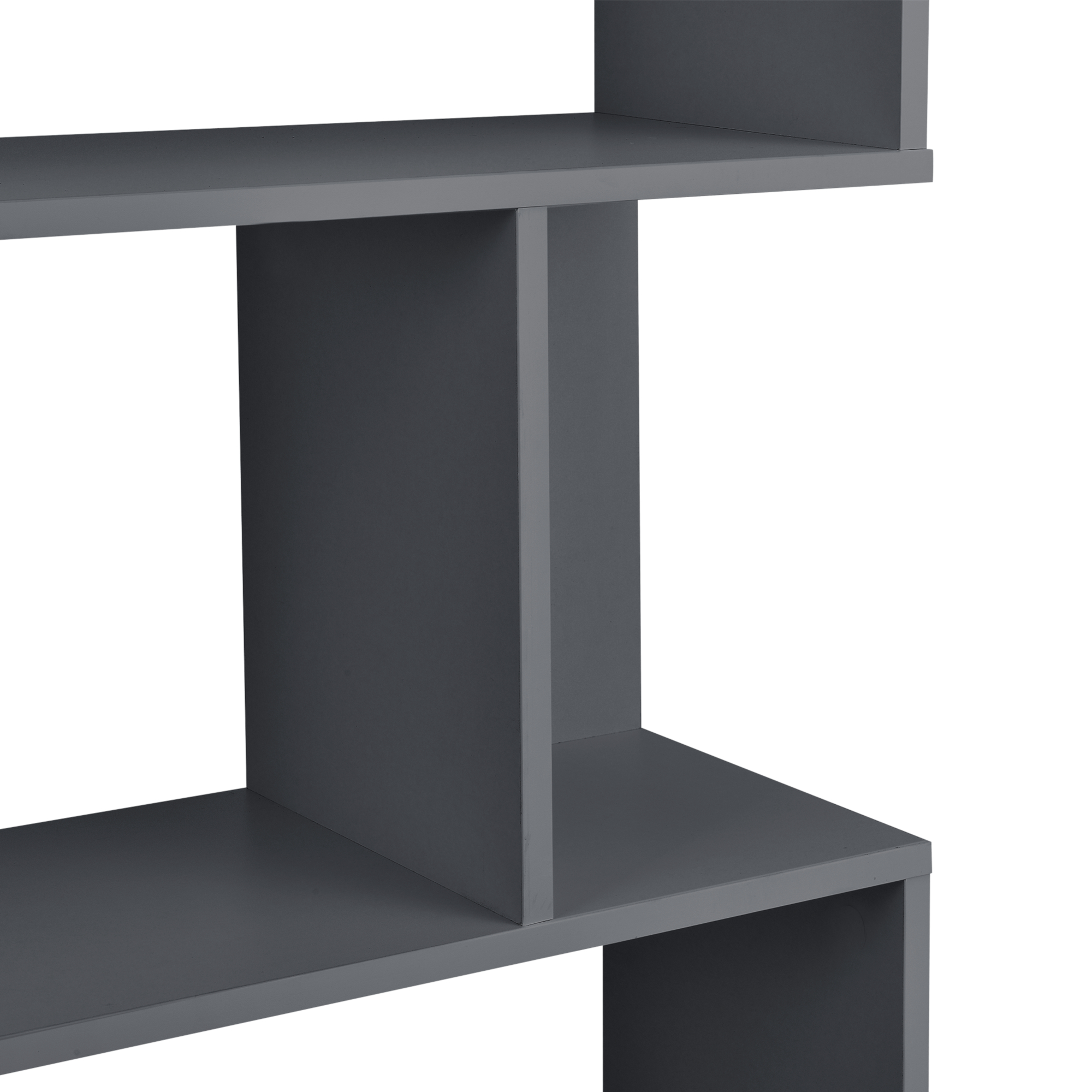 Această bibliotecă gri închis poate fi folosită în living pentru cărți și decorațiuni, în birou pentru documente și accesorii sau în dormitor pentru organizarea obiectelor preferate. Compartimentarea mixtă, cu zone deschise și închise vizual, oferă un aspect aerisit și modern.