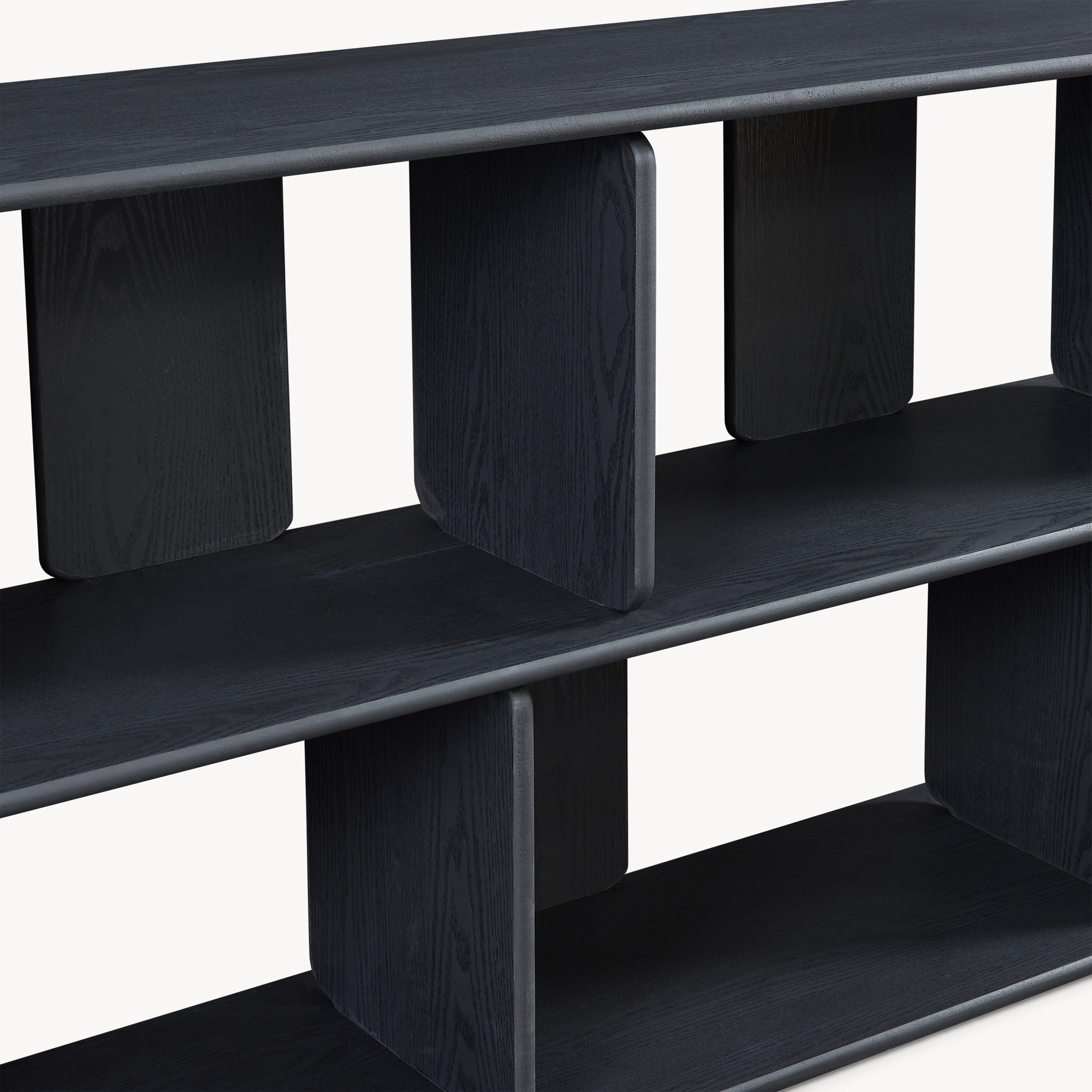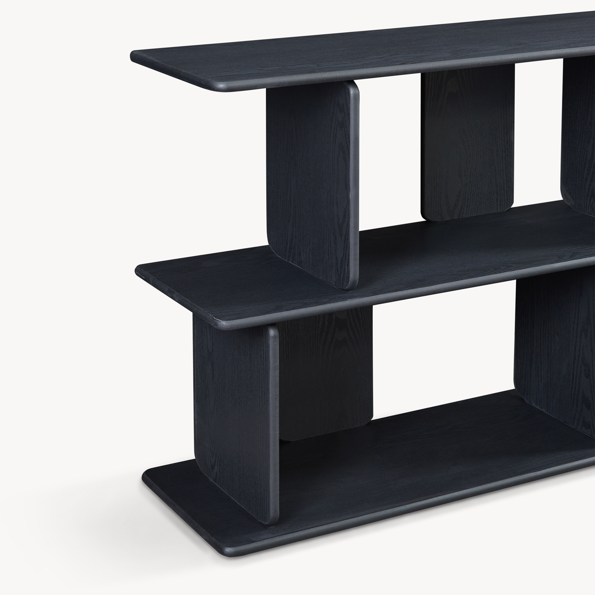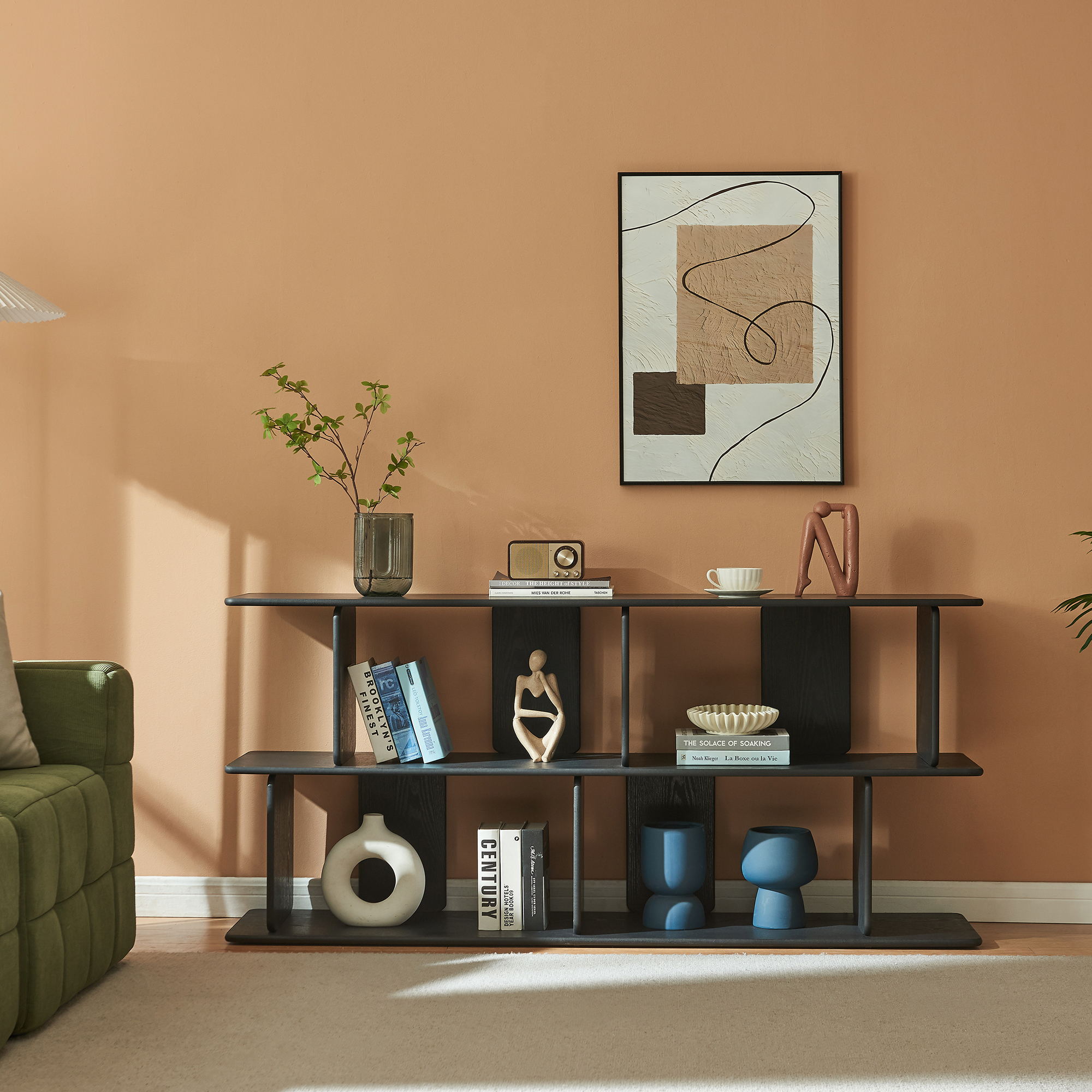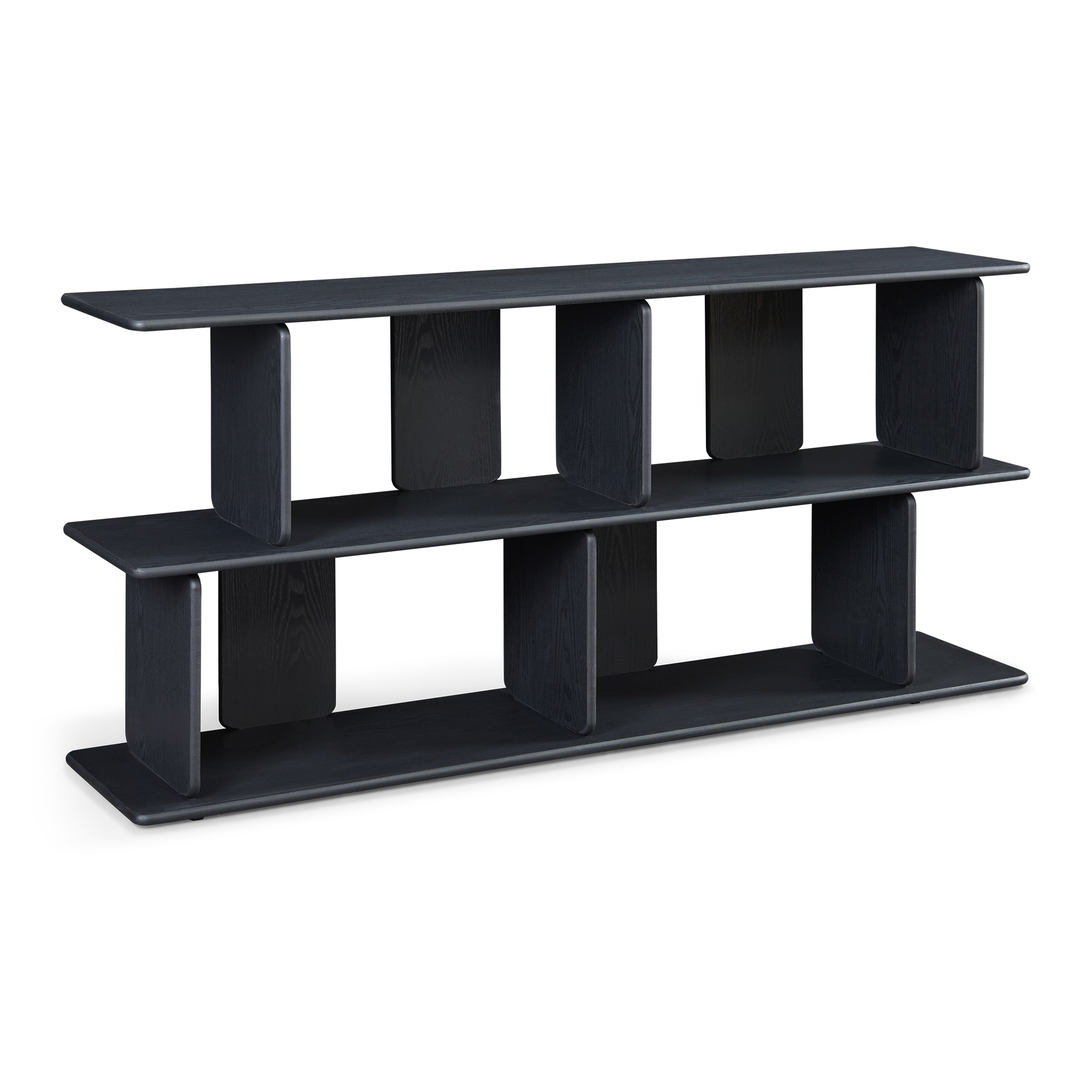 Cu un design contemporan și compartimentare deschisă, această bibliotecă joasă neagră îți permite să păstrezi la îndemână cărți, decorațiuni, cutii, documente sau accesorii multimedia. Blatul superior generos este ideal pentru rame foto, veioze, vaze sau obiecte decorative, iar cele patru compartimente deschise, dispuse decalat, oferă un plus de ordine și personalitate.