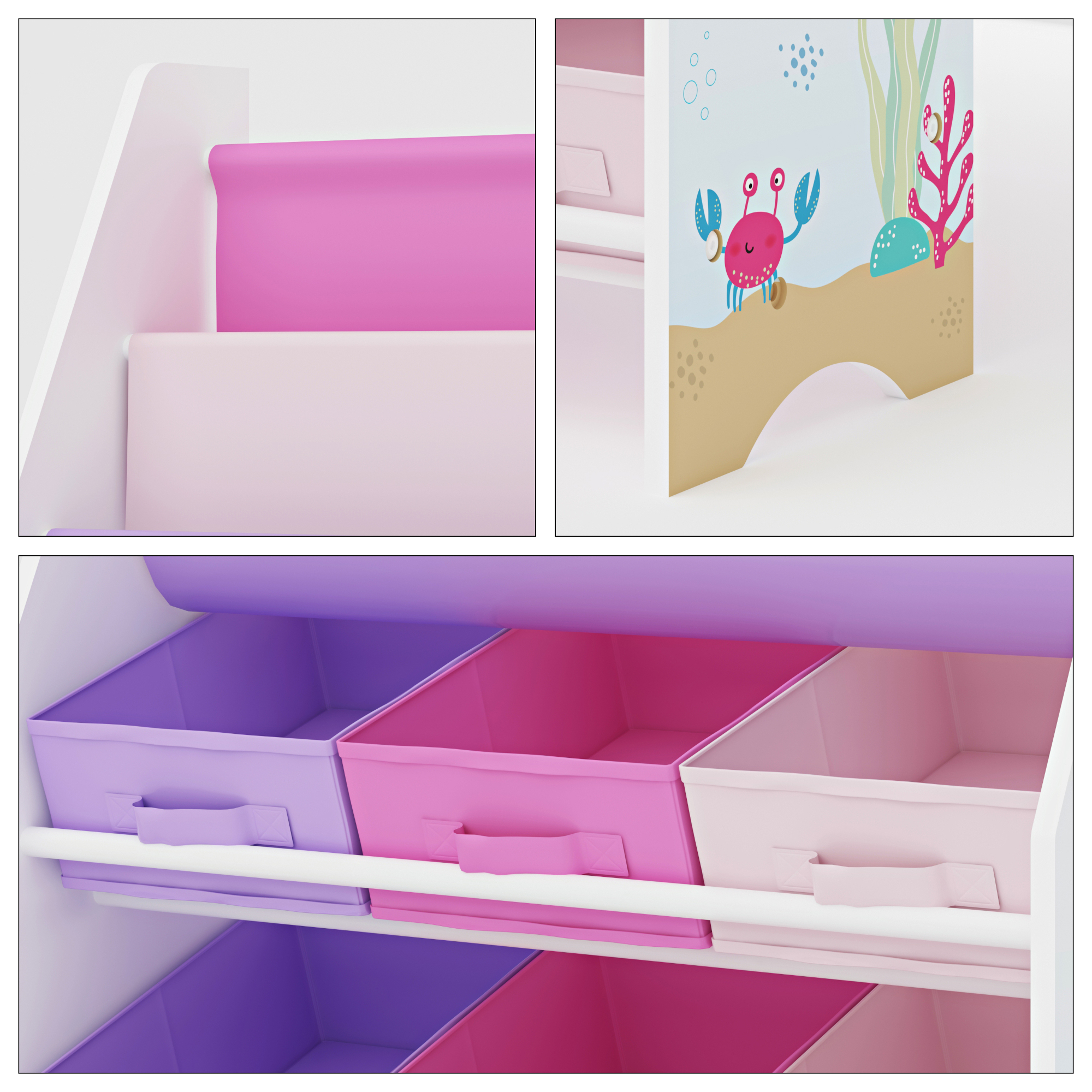 Bibliotecă pentru copii cu 6 cutii, model ocean, alb/roz/lila