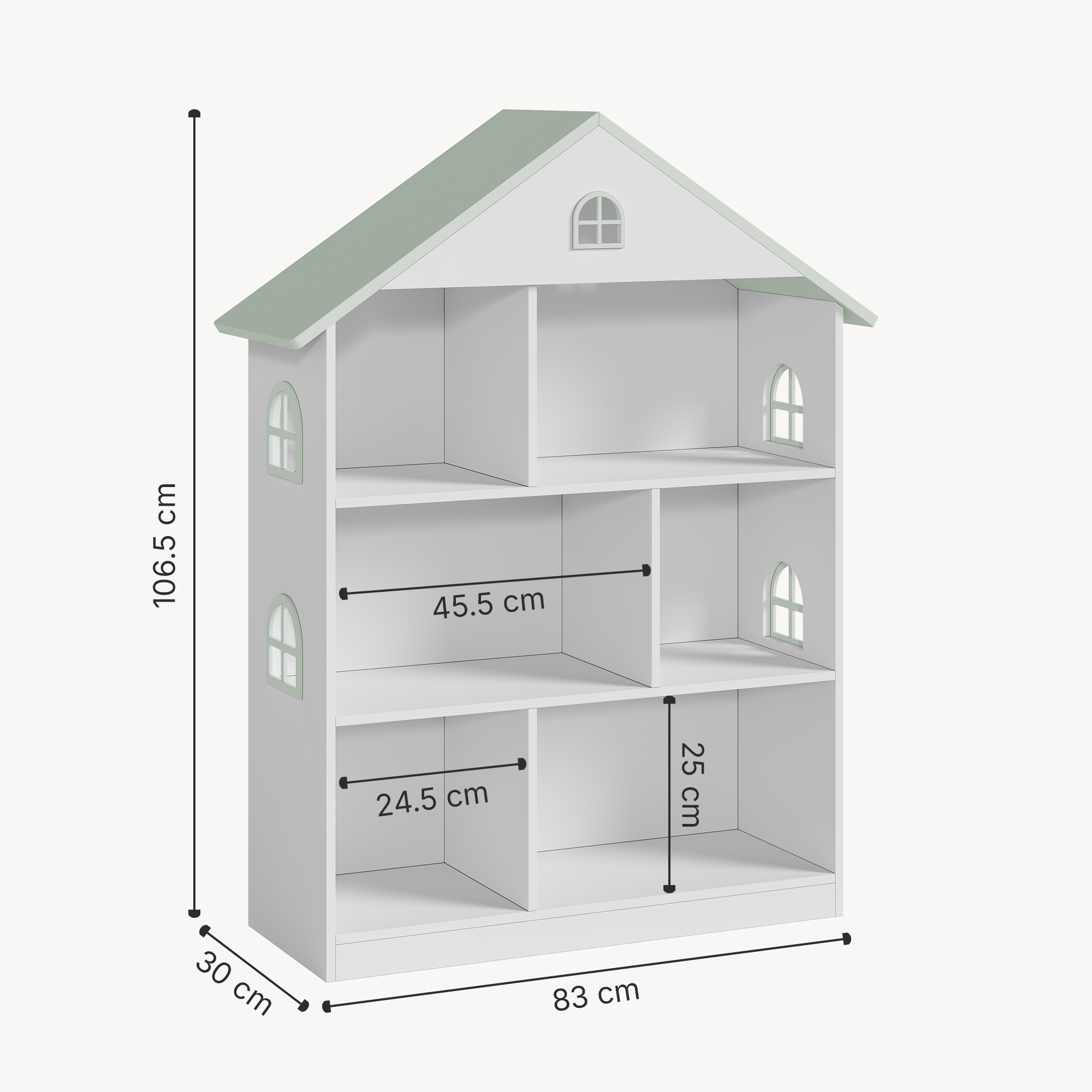 Bibliotecă pentru copii tip căsuță – o piesă practică și decorativă, perfectă pentru organizarea jucăriilor, cărților și accesoriilor din camera celui mic. Designul vesel, în formă de casă, adaugă un aer cald și jucăuș, iar combinația de alb cu verde mentă se integrează ușor într-un decor modern.