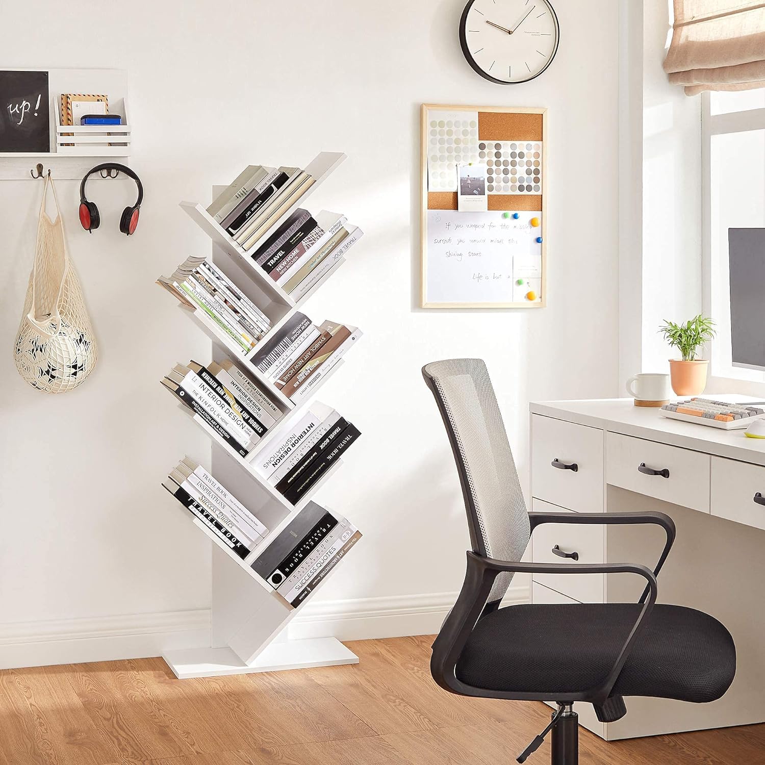 Adauga un plus de stil si organizare cu aceasta biblioteca tip copac VASAGLE, perfecta pentru living, dormitor, birou sau camera copiilor. Designul modern, cu 8 rafturi deschise dispuse in forma de ramuri, ofera un aspect decorativ aparte si te ajuta sa expui elegant carti, reviste sau obiecte decorative. Datorita formatului vertical, aceasta biblioteca alba pentru spatii mici ocupa putin loc la sol si valorifica eficient inaltimea camerei.