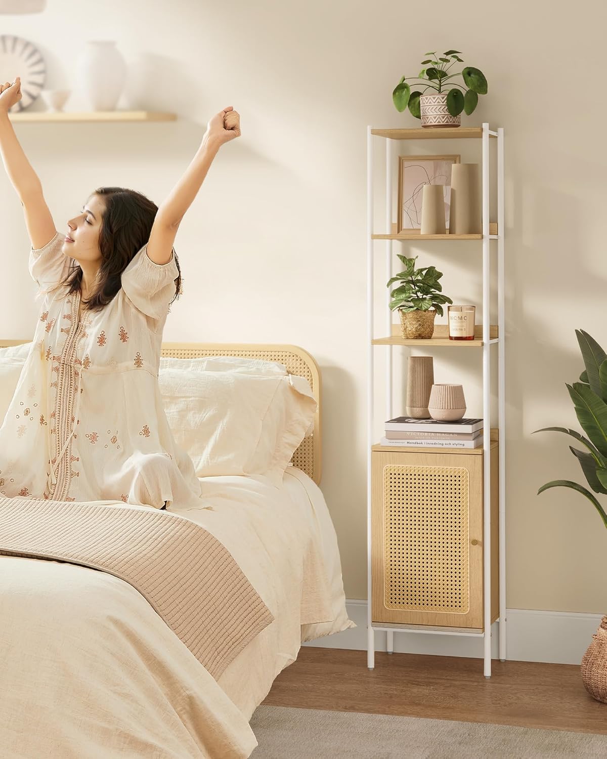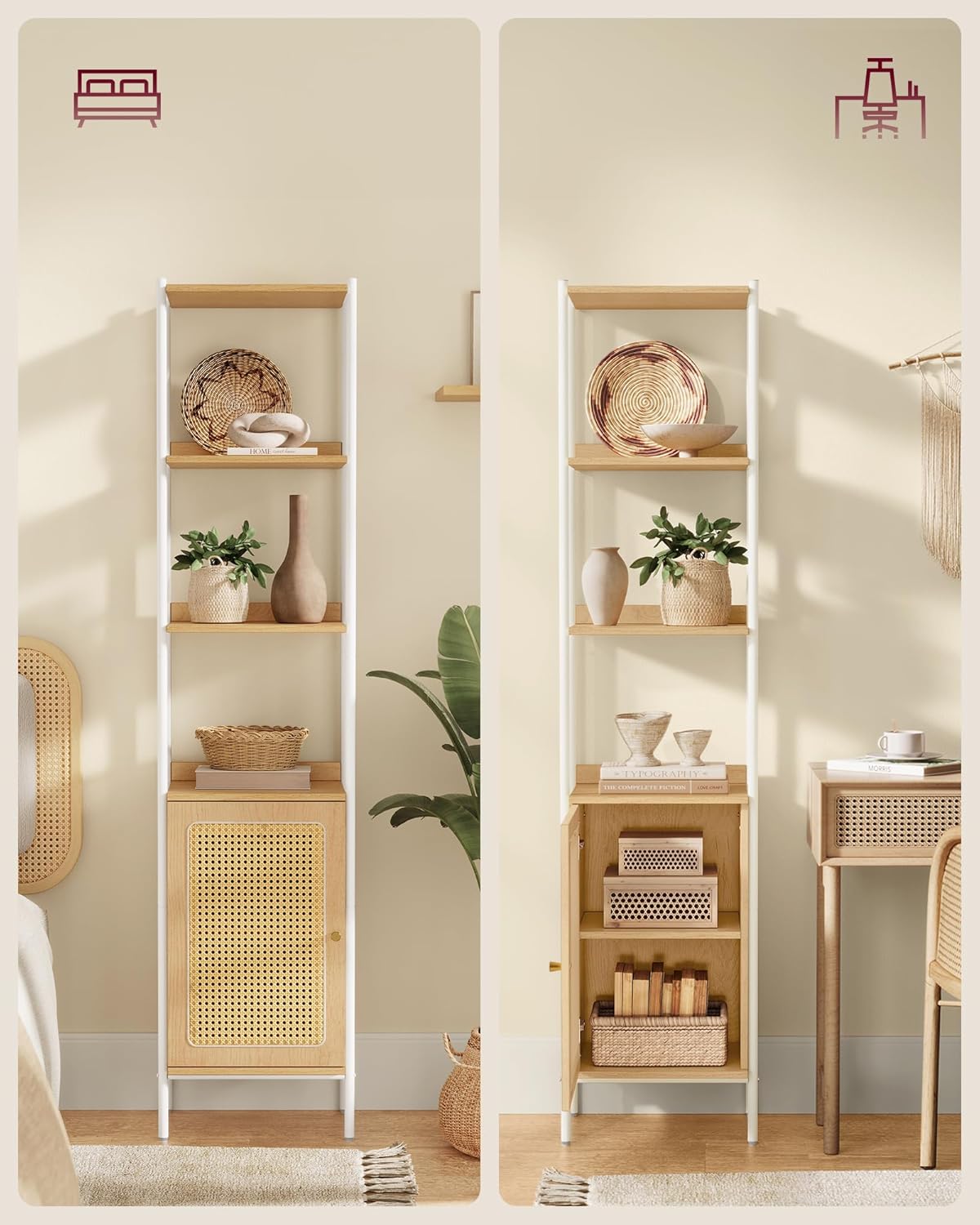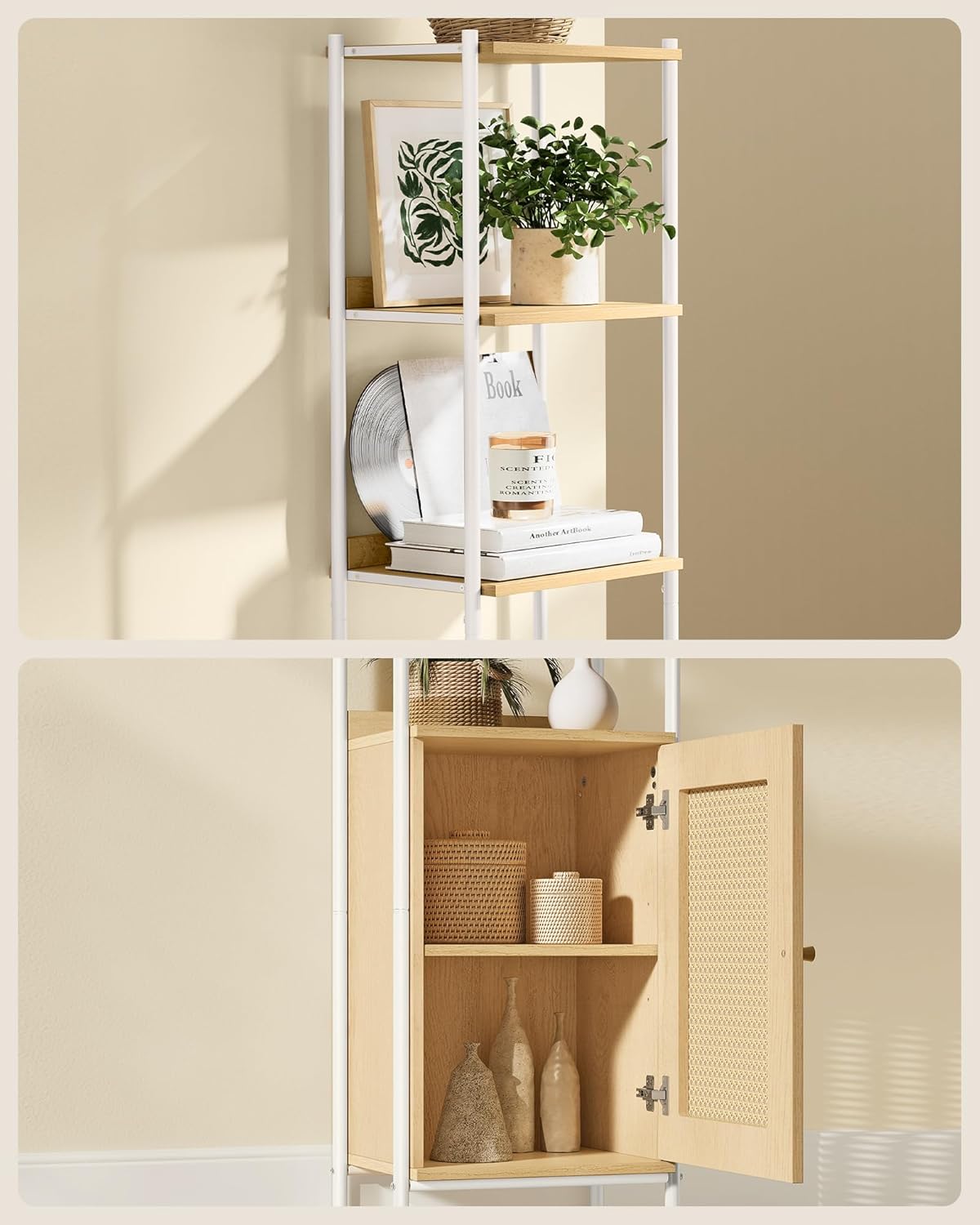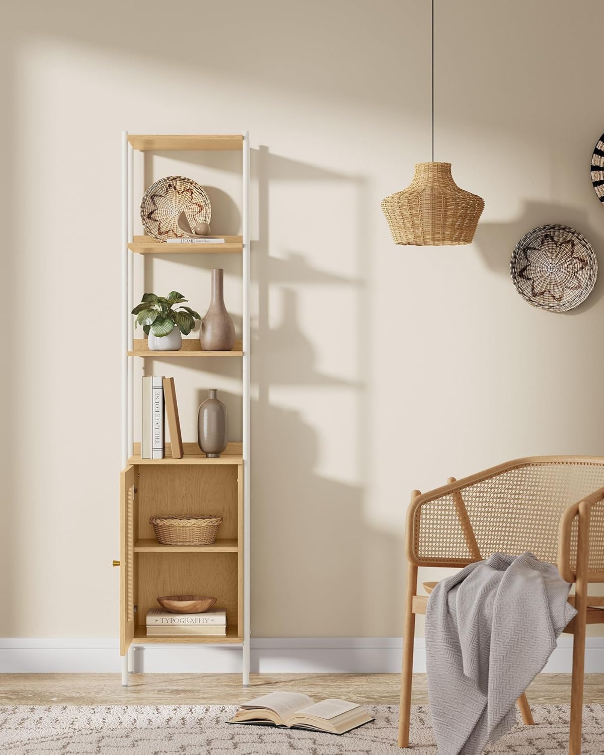 Adauga stil si organizare in locuinta ta cu aceasta biblioteca VASAGLE Boho, gandita pentru spatii moderne, aerisite si practice. Combinatia dintre cadrul metalic alb, politele in nuanta bej si usa cu aspect de ratan ofera un look cald si elegant, perfect pentru living, dormitor sau birou. Formatul ingust ajuta la valorificarea spatiului pe verticala, fara sa incarce vizual incaperea.