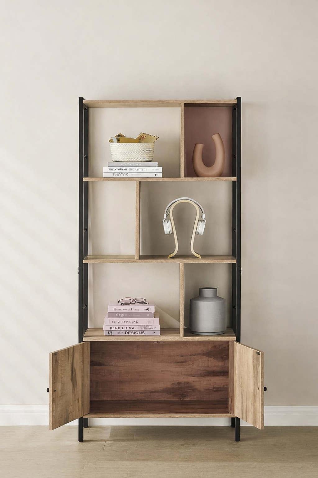 Alege o bibliotecă industrială practică și elegantă pentru un decor modern și bine organizat. Modelul VASAGLE combină armonios rafturile deschise cu un dulap inferior cu 2 uși, oferind spațiu pentru expunerea cărților, decorațiunilor sau plantelor, dar și pentru depozitarea discretă a obiectelor pe care vrei să le ai la îndemână.