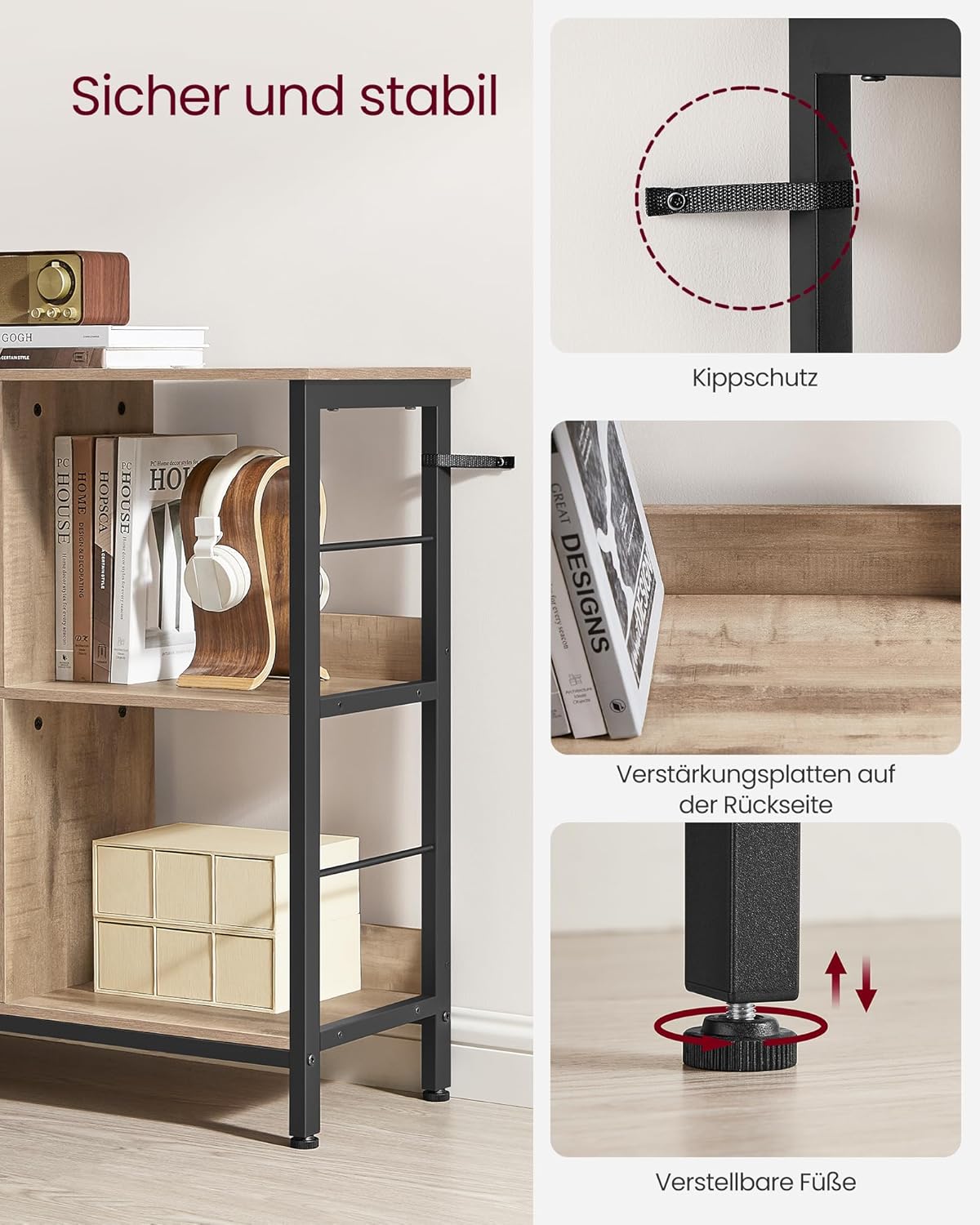 Structura este gandita pentru utilizare zilnica: barele laterale metalice ajuta la sustinerea obiectelor, marginile din spate adauga stabilitate, iar picioarele reglabile contribuie la o pozitionare echilibrata chiar si pe suprafete usor denivelate. In plus, biblioteca include sistem anti-rasturnare pentru fixare sigura pe perete.