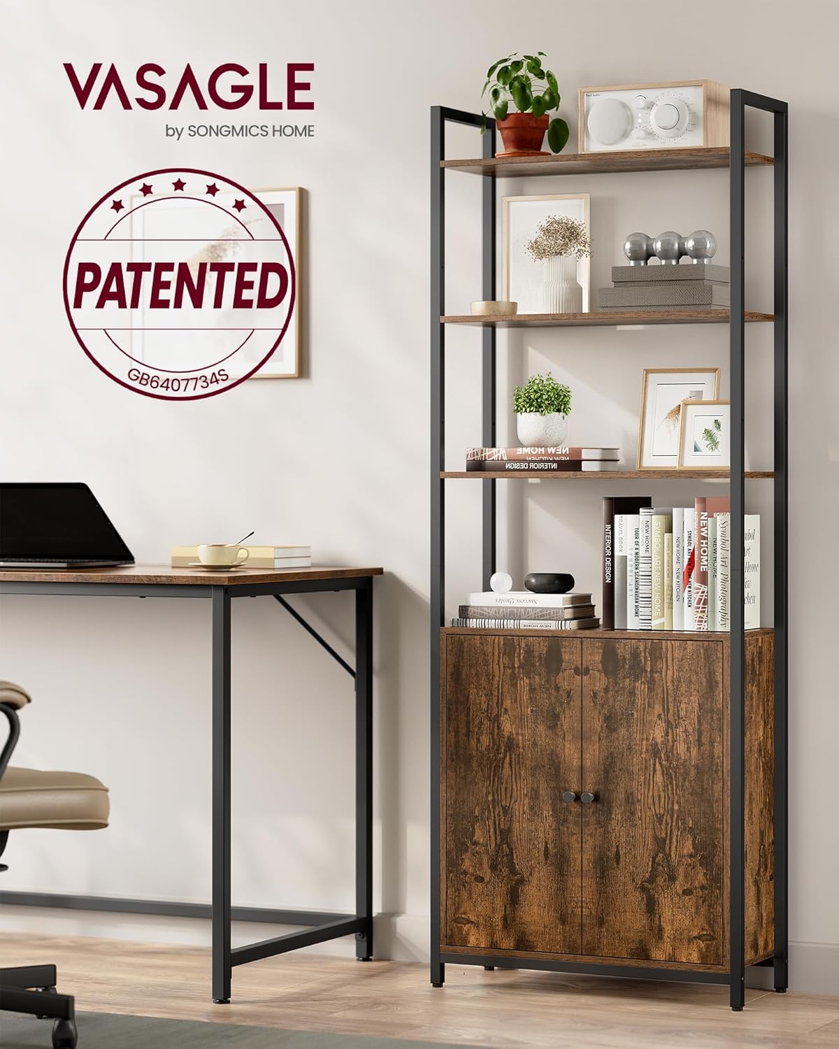 Biblioteca VASAGLE cu 6 polite si dulap, metal si PAL, maro rustic