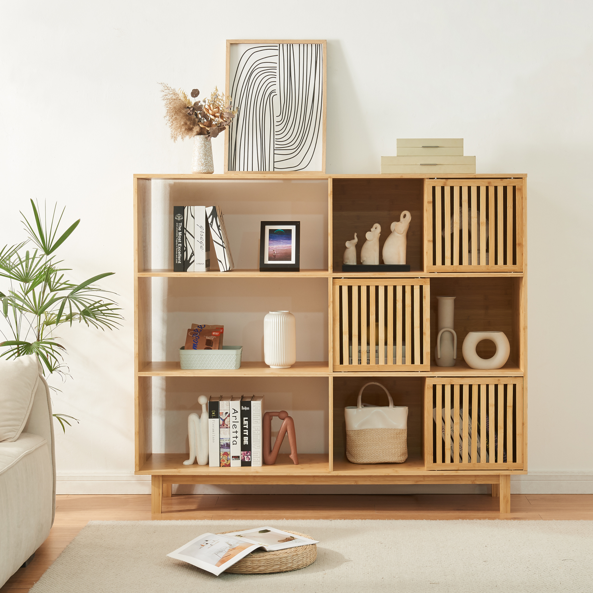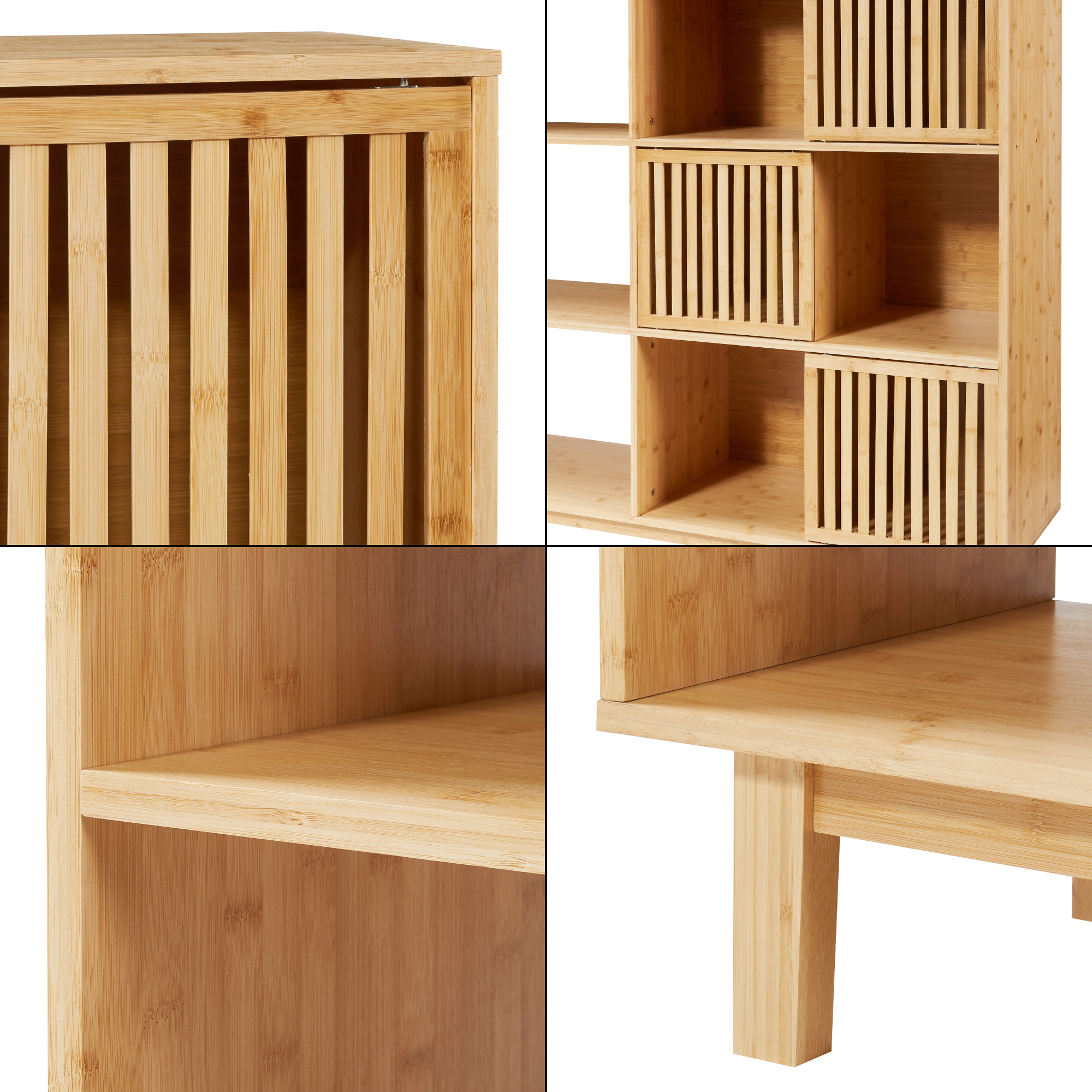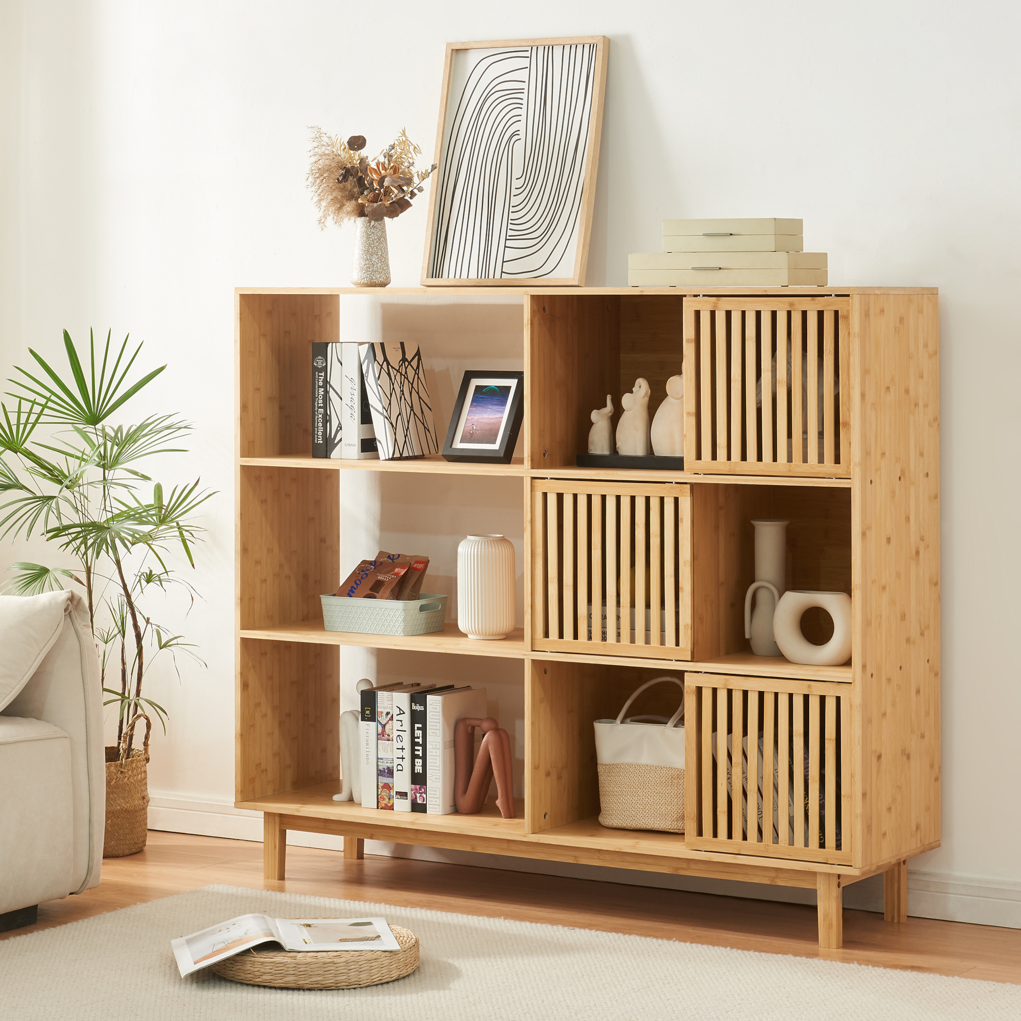 Bibliotecă Ypäjä din bambus cu 9 compartimente și 3 uși glisante