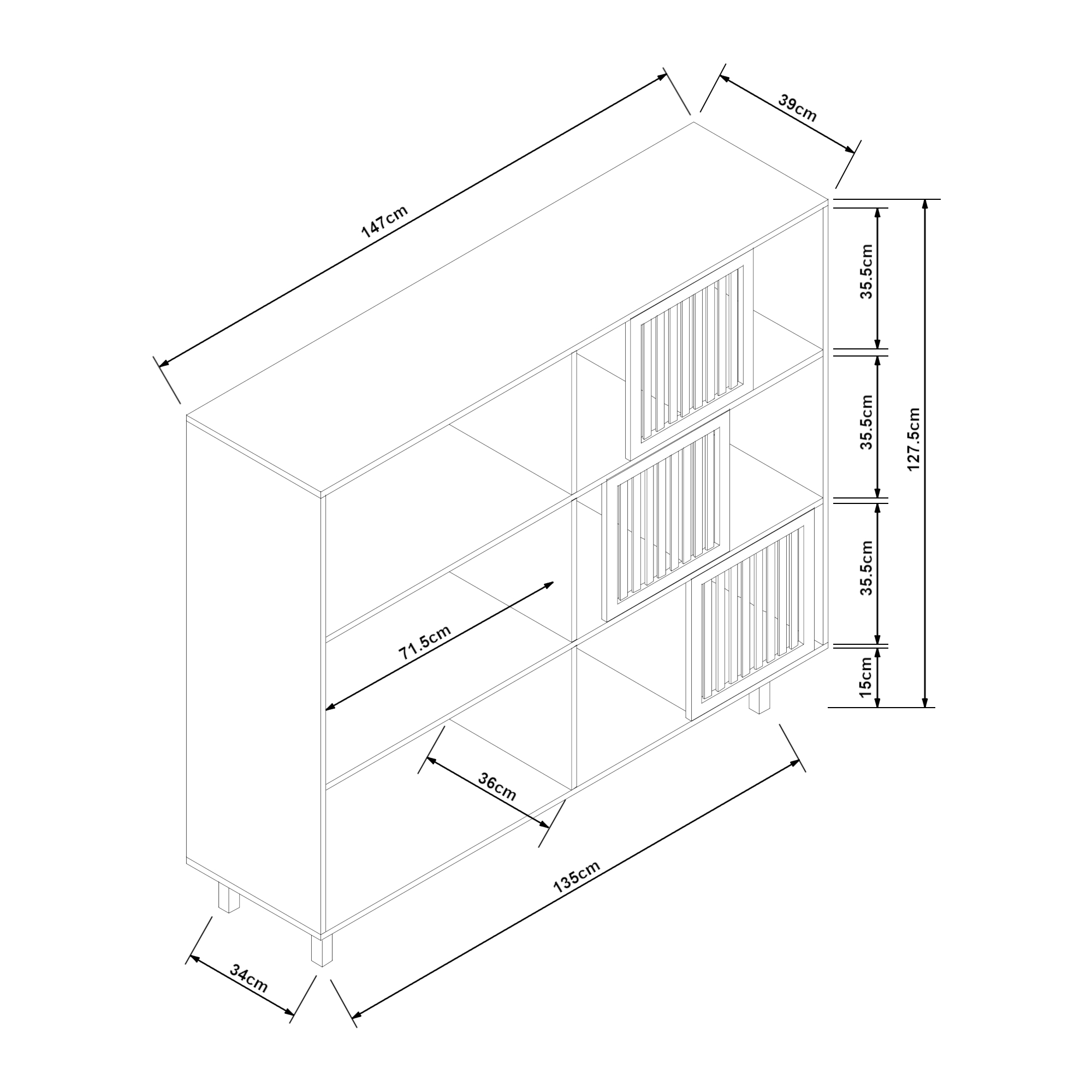 Modelul dispune de 9 compartimente de depozitare, dintre care 3 sunt complet deschise, perfecte pentru cărți, plante, rame foto sau obiecte decorative. Celelalte 6 compartimente sunt prevăzute cu spate, iar cele 3 uși glisante mobile îți permit să alegi rapid ce zone rămân la vedere și ce obiecte vrei să păstrezi discret ascunse.