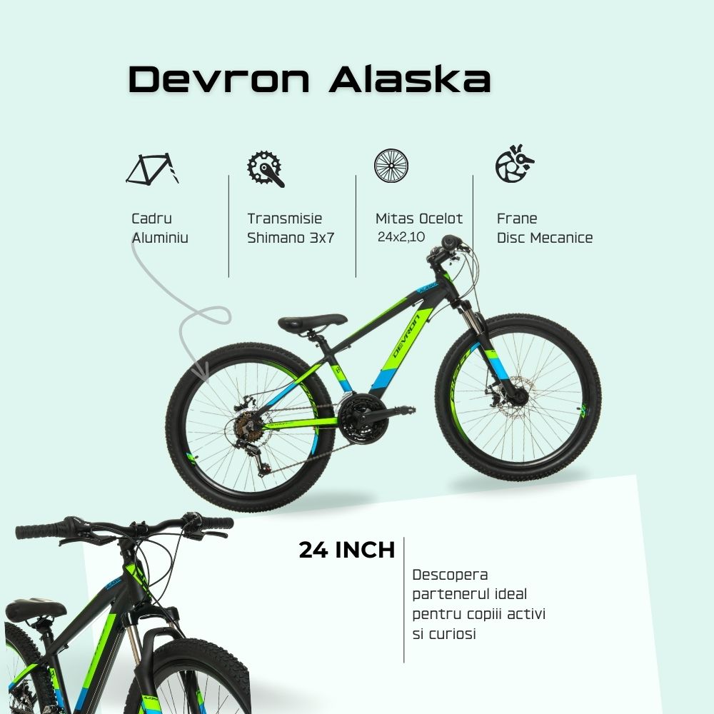 Devron Alaska 24 inch este partenerul perfect pentru micii aventurieri, combinand siguranta, confortul si performanta intr-un design modern. Cu dotari premium si materiale de calitate, aceasta bicicleta transforma fiecare plimbare intr-o experienta de neuitat.