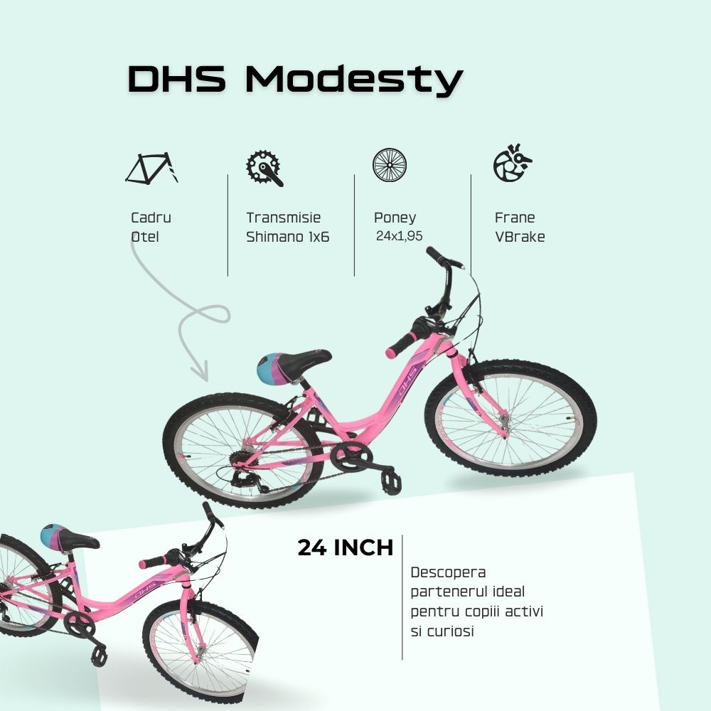 DHS Modesty 24 inch este bicicleta ideala pentru copiii care isi doresc mai multa libertate si independenta in aventurile lor zilnice. Sigura, confortabila si usor de utilizat, aceasta bicicleta este pregatita sa devina insotitorul perfect al fiecarui copil curios si activ. Comanda acum si adu bucuria pe doua roti in viata celor mici!