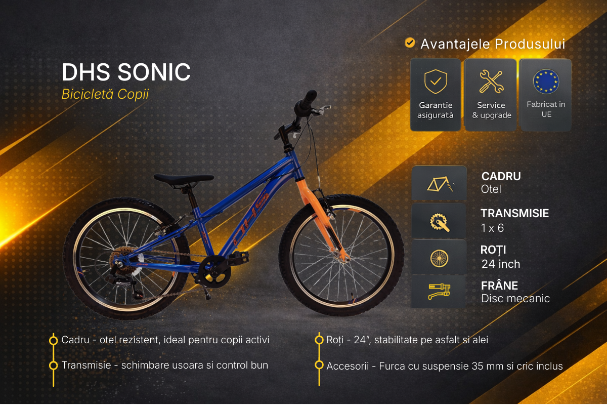 DHS Sonic 20 inch este bicicleta perfecta pentru copii cu varsta intre 7 si 11 ani, oferind un mix excelent de control, confort si design atractiv. Cu transmisie eficienta si frane sigure, acest model ii ajuta pe cei mici sa exploreze mediul inconjurator cu incredere si bucurie.