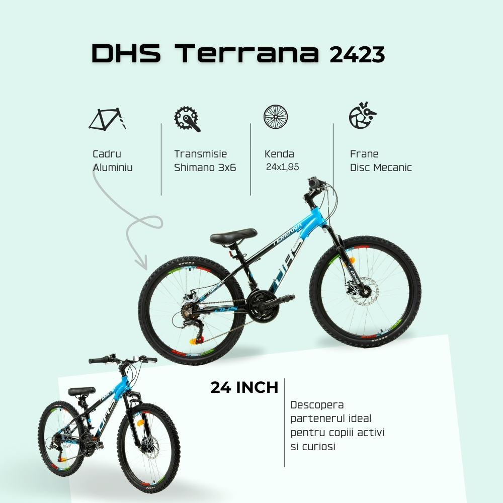 Bicicleta DHS Terrana 2423 este alegerea excelenta pentru copiii care vor sa se bucure de plimbari dinamice si sigure. Cu un design solid, echipare completa si performanta remarcabila, acest model transforma fiecare iesire intr-o aventura pe doua roti. Ofera-i celui mic libertatea de a descoperi lumea cu DHS Terrana!