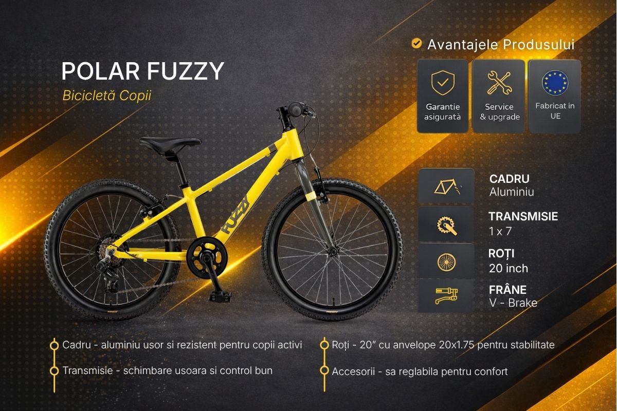 Polar Fuzzy 20 Inch este o bicicleta usoara si versatila, conceputa pentru copiii cu varsta intre 7 si 11 ani care isi doresc mai multa libertate si control in timpul mersului. Datorita cadrului din aluminiu si echiparii cu transmisie Shimano, aceasta bicicleta ofera o experienta sigura si dinamica, ideala pentru plimbari zilnice si trasee usoare.