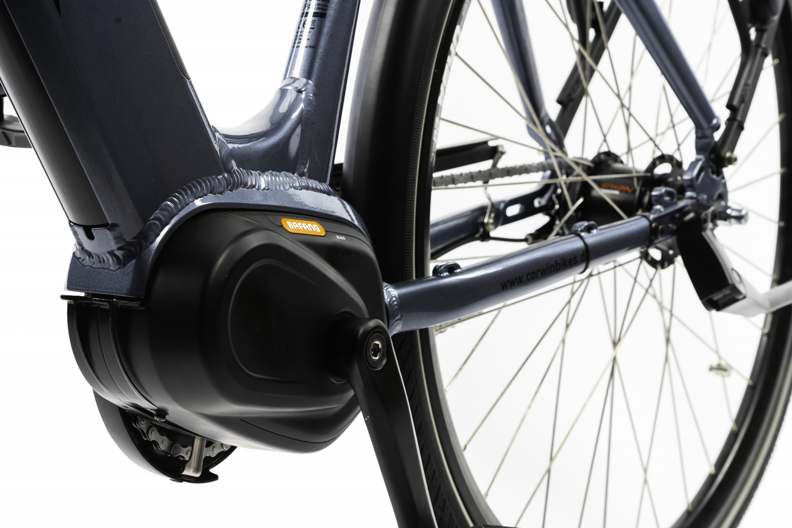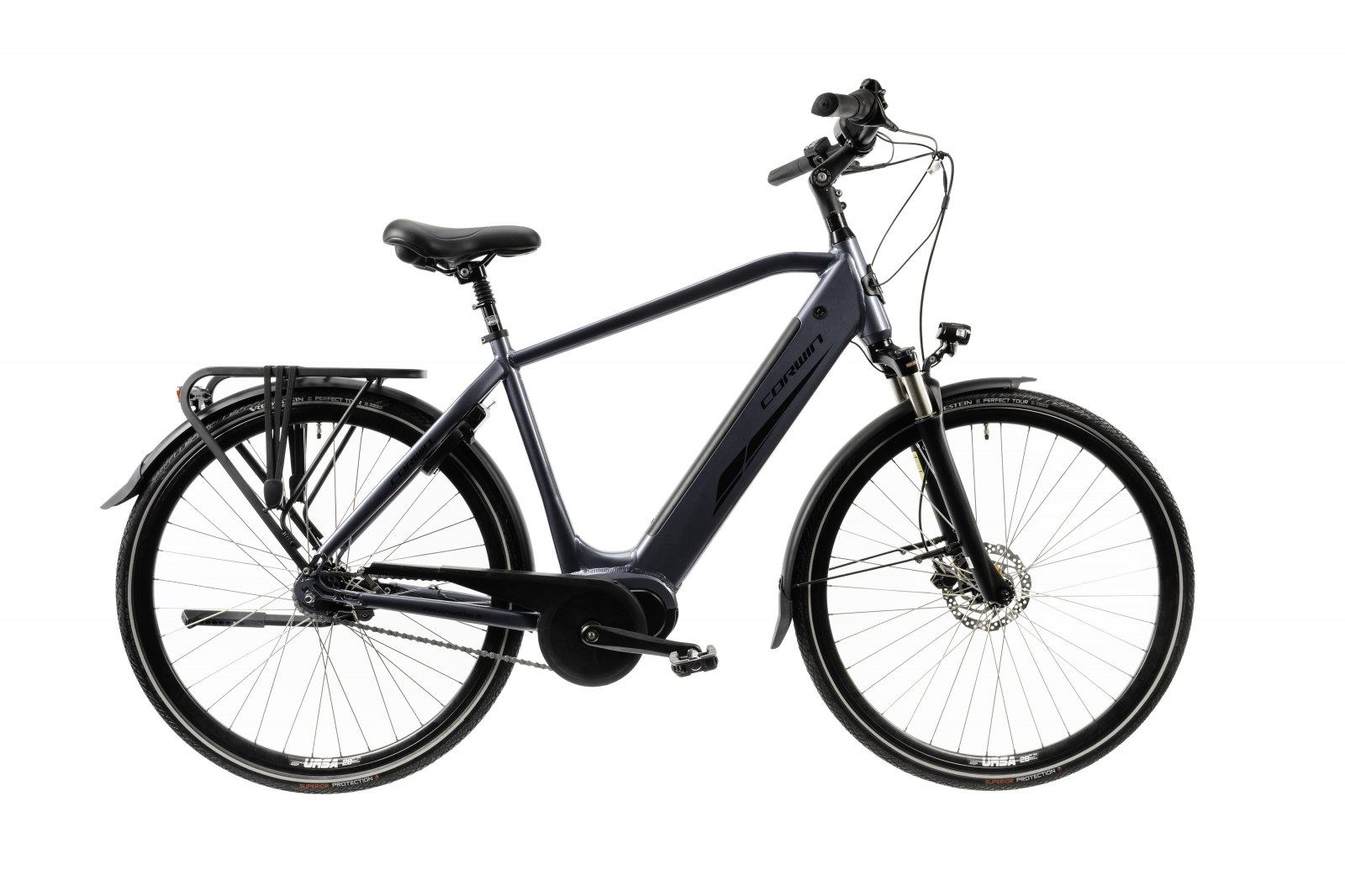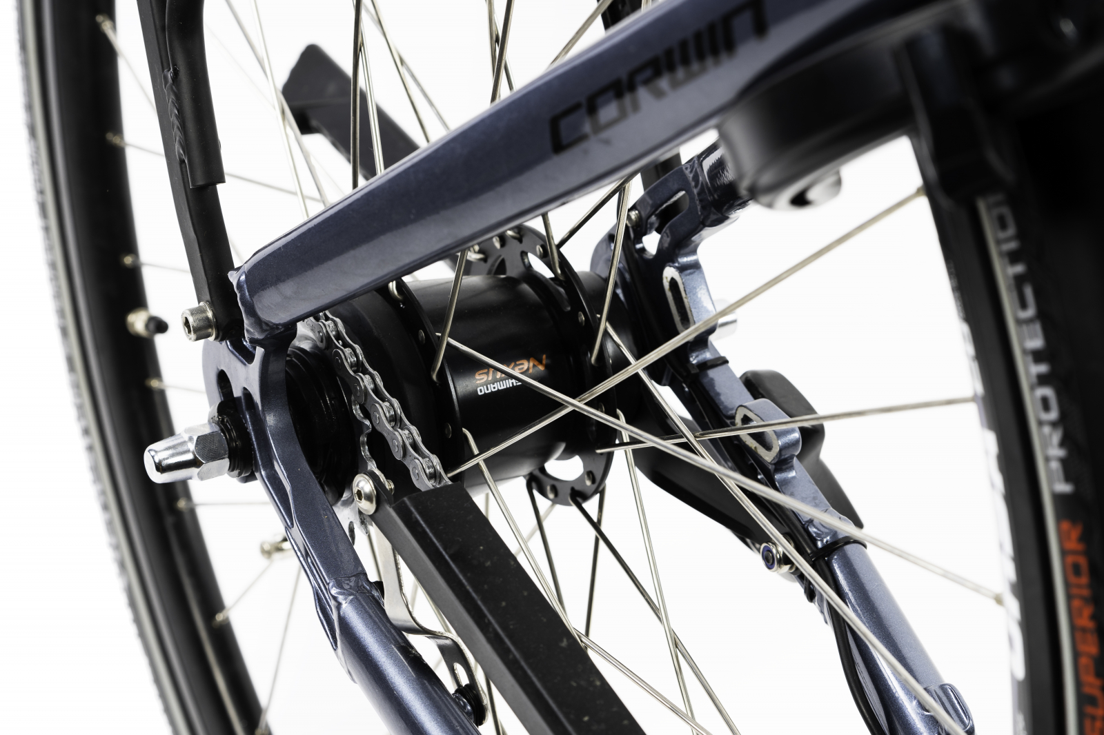 - Ebike Corwin 28427 este echipata cu roti de 28 inch, anvelope Vredestein Perfect Tour, Antipuncture, Reflex Line , are o echipare Shimnao, o transmisie 1x7 viteze, frane hiraulic epe disc fata si Topedo pe spate.