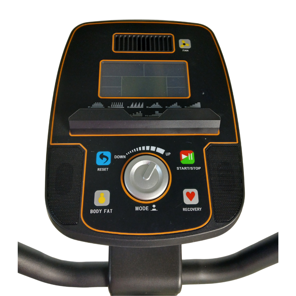 Bicicleta fitness KINGDOM SPORTS este o bicicleta cu rezistenta magnetica, reglabila pe 32 niveluri de dificultate. Bicicleta este prevazuta cu o volanta de 9 kg, care asigura o functionare lina si silentioasa. Pentru un antrenament cat mai confortabil pentru utilizator, saua este reglabila atat pe verticala cat si pe orizontala, iar ghidonul este, de asemenea, ajustabil. Consola cu ecran LCD si senzorii de puls din manere ofera date utile despre antrenamentele dvs. Rotile de transport si sistemul pentru nivelarea suprafetelor inegale sunt alte detalii practice ale acestui model.