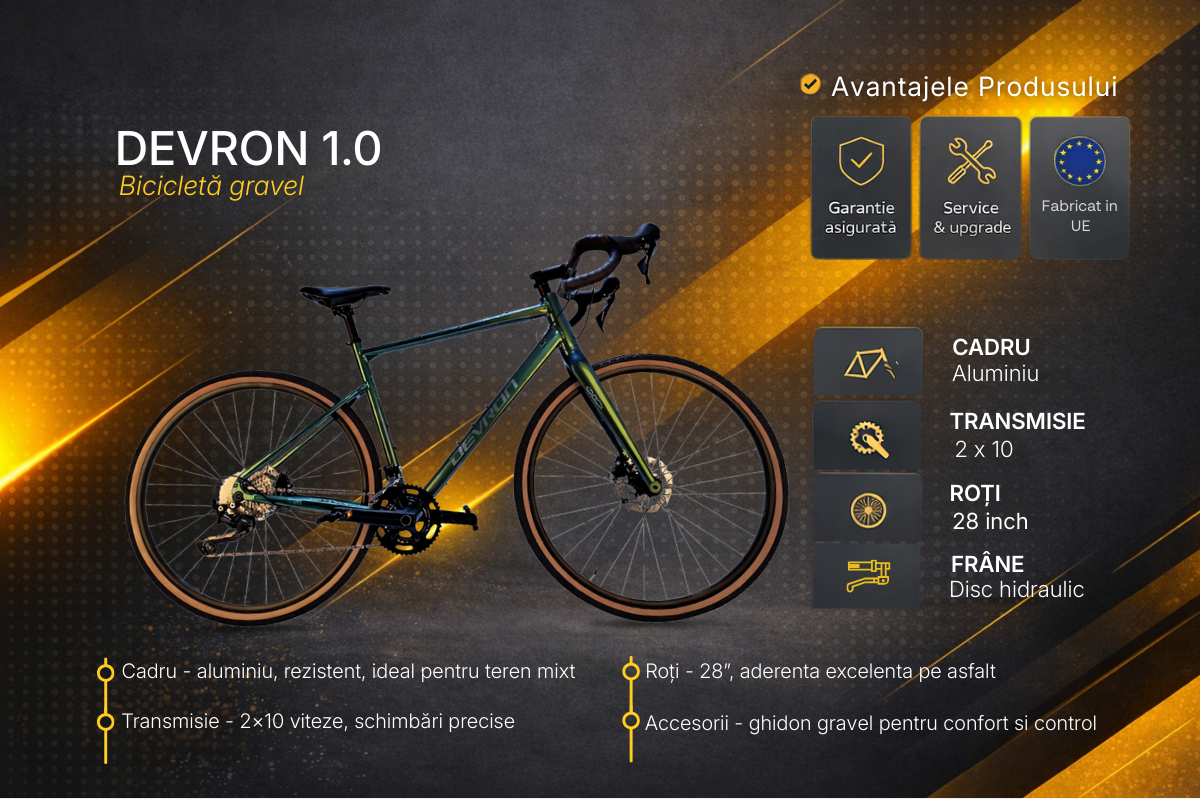 Devron 1.0 28 inch este bicicleta gravel ideala pentru aventurieri si exploratori urbani care cauta performanta, confort si control pe drumuri variate. Cu echipare de calitate si design bine balansat, acest model te insoteste cu succes la fiecare tura.