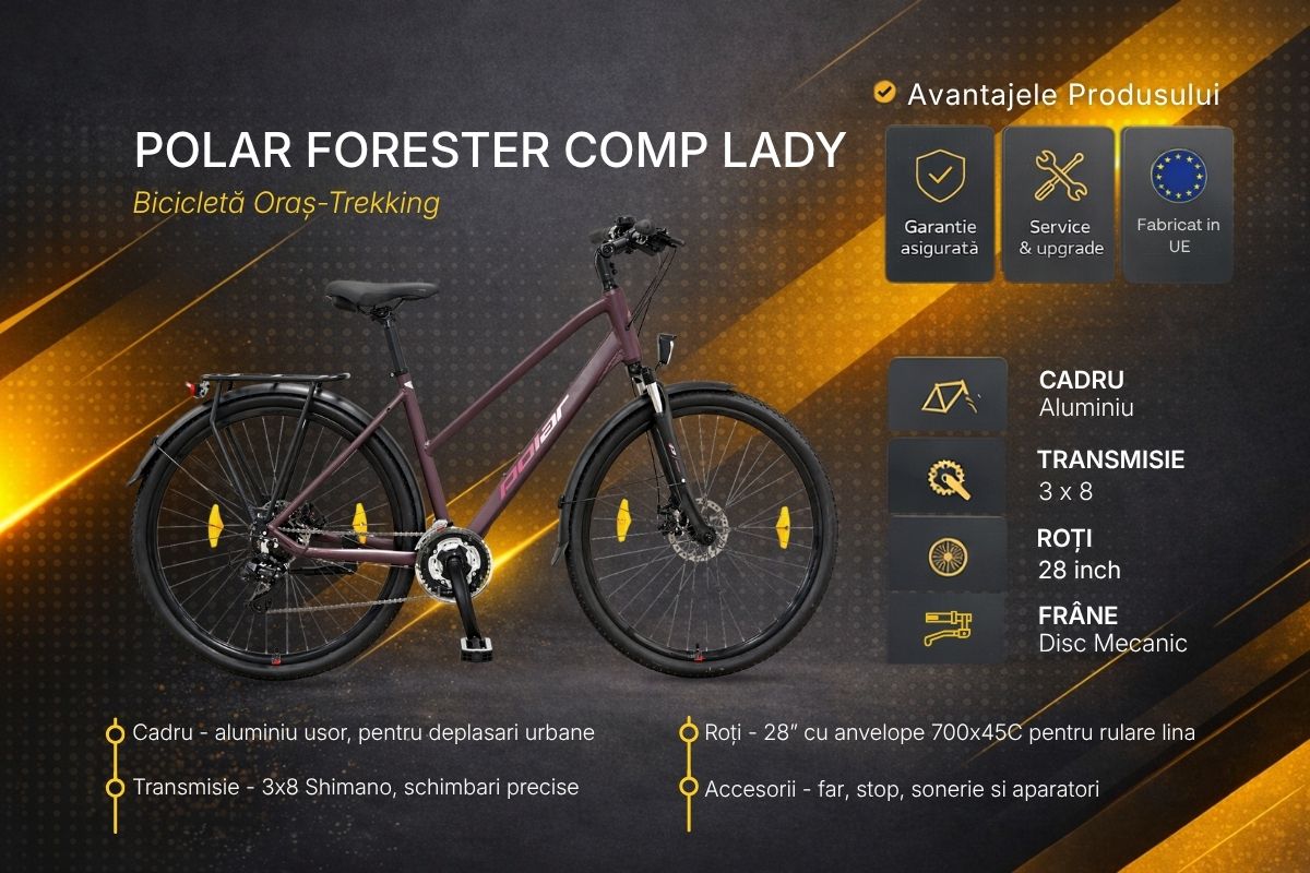 Polar Forester Comp Lady este o bicicleta de oras/trekking confortabila si versatila, ideala pentru deplasari zilnice si plimbari mai lungi. Cu cadru din aluminiu, roti de 28 inch si transmisie 3x8 viteze, ofera stabilitate, eficienta si o pozitie relaxata la pedalare, fiind potrivita atat pentru oras, cat si pentru drumuri usoare in afara acestuia.