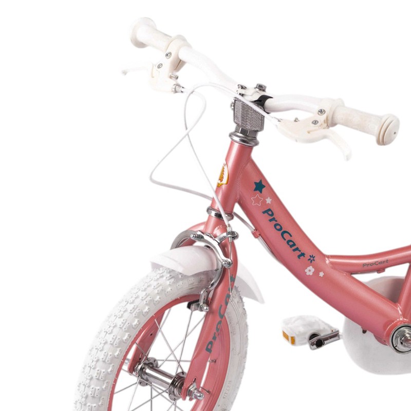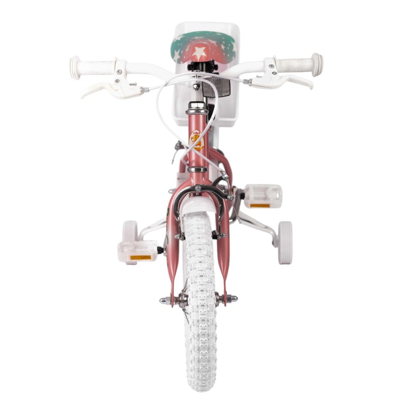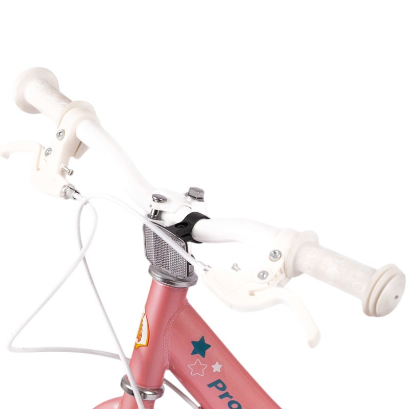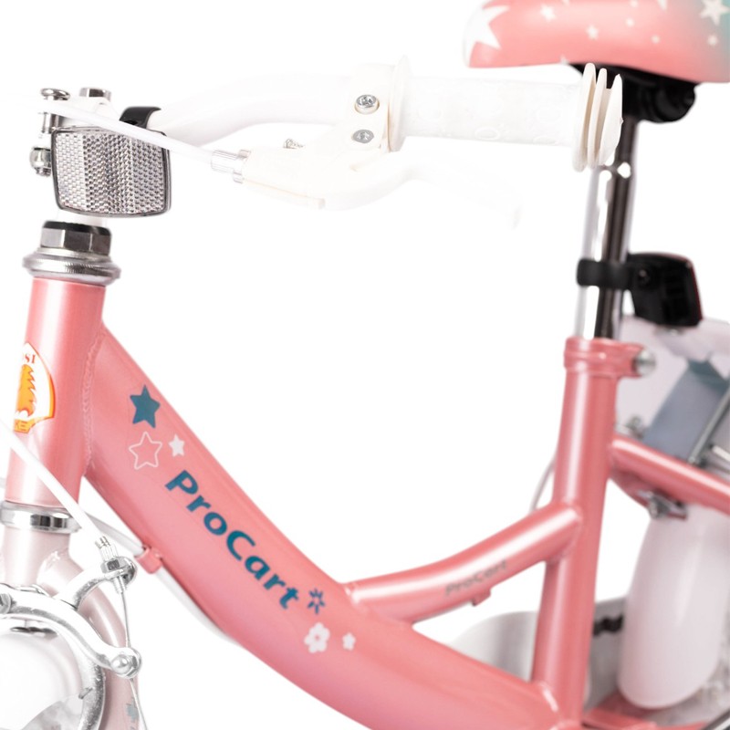 Bicicleta este decorata in culori vesele de roz, albastru si alb, avand imprimeuri fermecatoare cu unicorni si stelute, care aduc un plus de magie fiecarei plimbari.