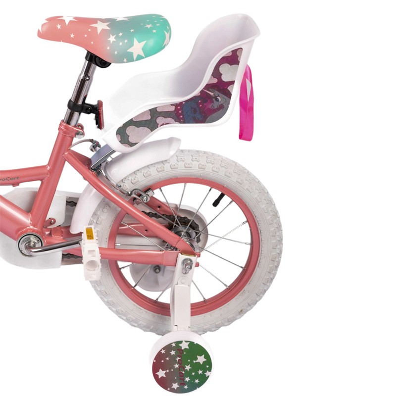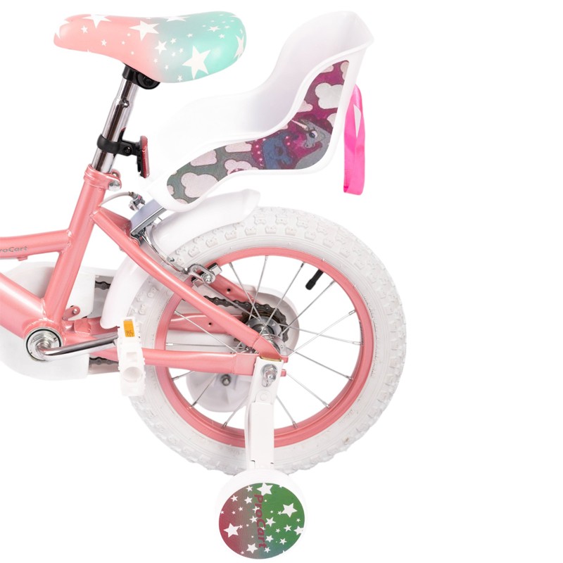 Bicicleta pentru copii cu roti ajutatoare, 12 inch, scaun papusi, cadru otel, frane v-brake, unicorn roz MultiMark GlobalProd