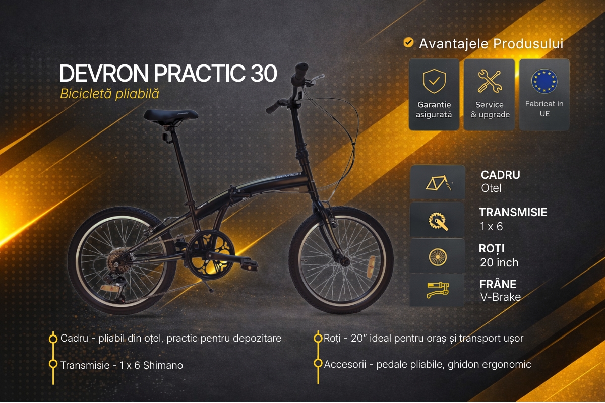Devron Practic 30 20 inch este bicicleta pliabila potrivita pentru cei care cauta mobilitate maxima in mediul urban, fara compromis la confort si siguranta. Compacta, practica si usor de folosit, acest model transforma fiecare deplasare intr-o experienta simpla si eficienta.