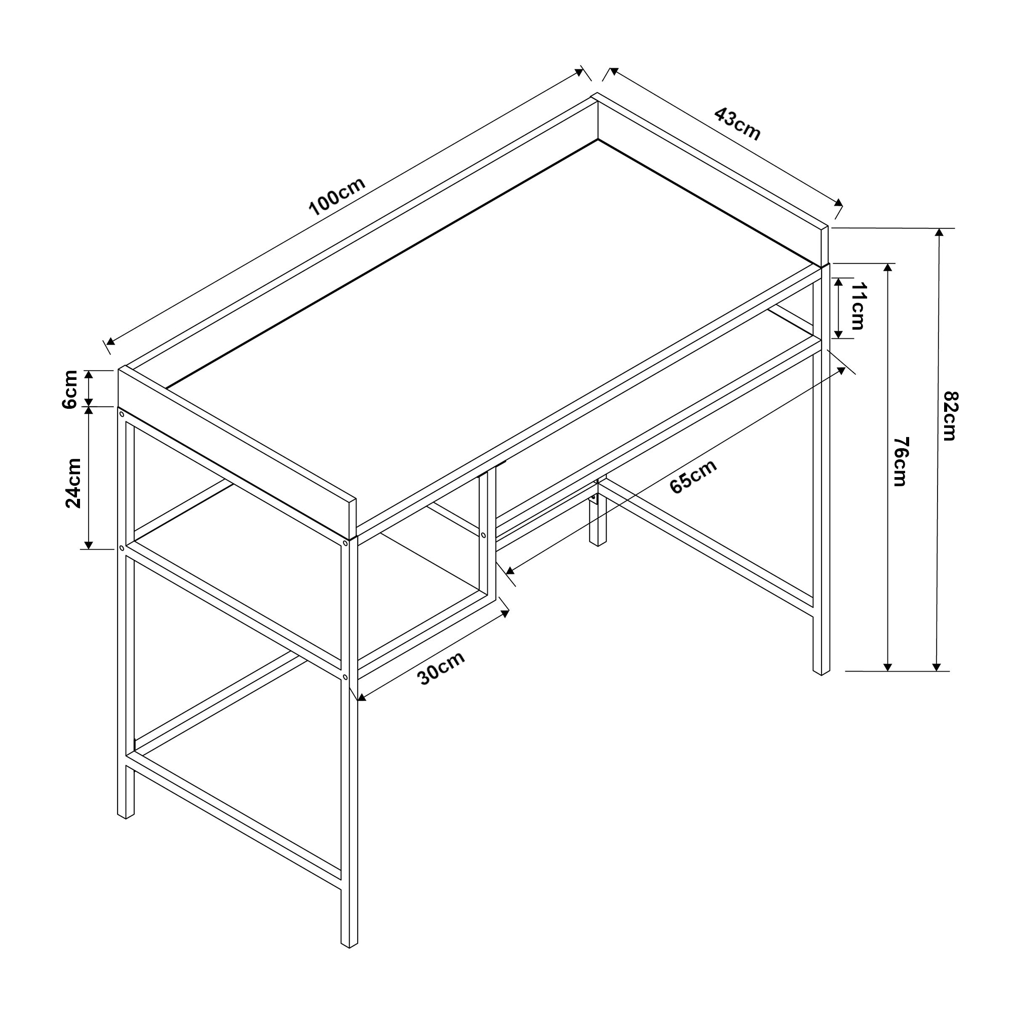 Blatul generos ofera suficient spatiu pentru laptop, monitor, caiete, documente si accesorii de birou. In plus, cele doua polite deschise amplasate sub blat sunt foarte utile pentru carti, acte, decoratiuni sau obiectele pe care vrei sa le ai mereu la indemana. Marginile inaltate ale blatului contribuie la o organizare mai buna si completeaza aspectul modern al piesei.