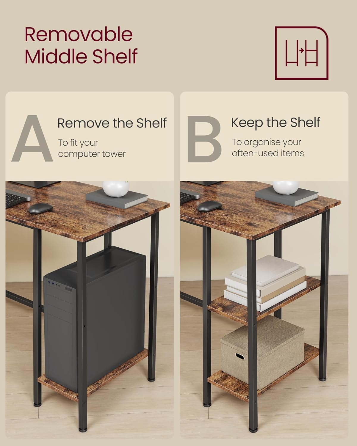 Birou de colt in forma de L VASAGLE cu 2 rafturi, maro rustic, 130x130x76 cm