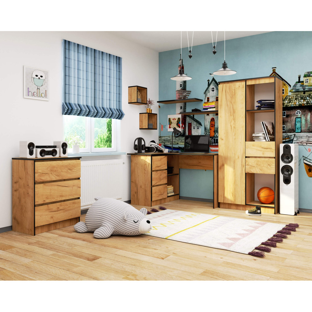 Alege un birou de colt stanga practic si modern, potrivit pentru birou, camera de tineret sau zona de studiu. Acest birou cu 3 sertare si rafturi ofera un echilibru excelent intre spatiu de lucru si depozitare, fiind realizat din PAL laminat rezistent, cu finisaj elegant stejar craft. Forma de colt ajuta la utilizarea eficienta a spatiului, iar blatul generos iti permite sa organizezi usor monitorul, laptopul, documentele si accesoriile necesare.
