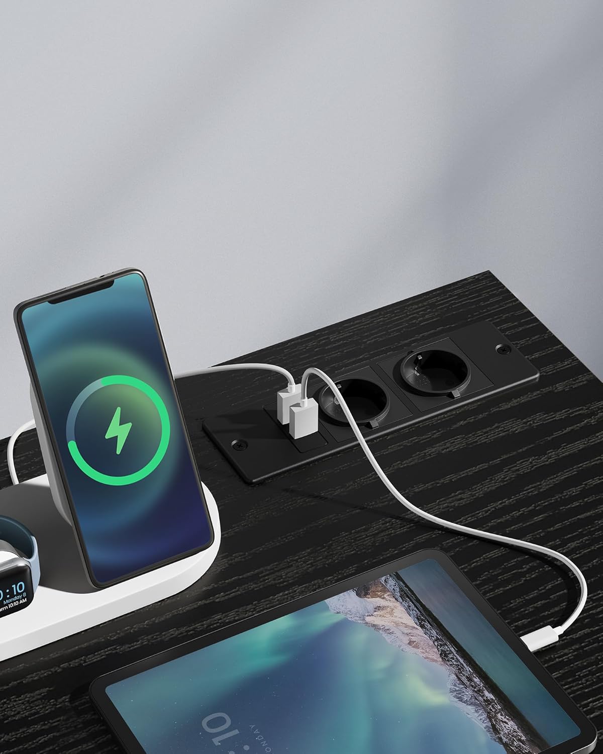 Cu 2 prize AC si 2 porturi USB integrate, poti alimenta rapid laptopul, telefonul, monitorul sau alte accesorii, fara prelungitoare incomode. Banda LED inclusa ofera un plus de stil si atmosfera, avand 20 de culori, 6 moduri de iluminare, 5 niveluri de luminozitate si 5 frecvente de clipire. Astfel, acest birou cu LED este perfect pentru un spatiu modern, functional si placut vizual.