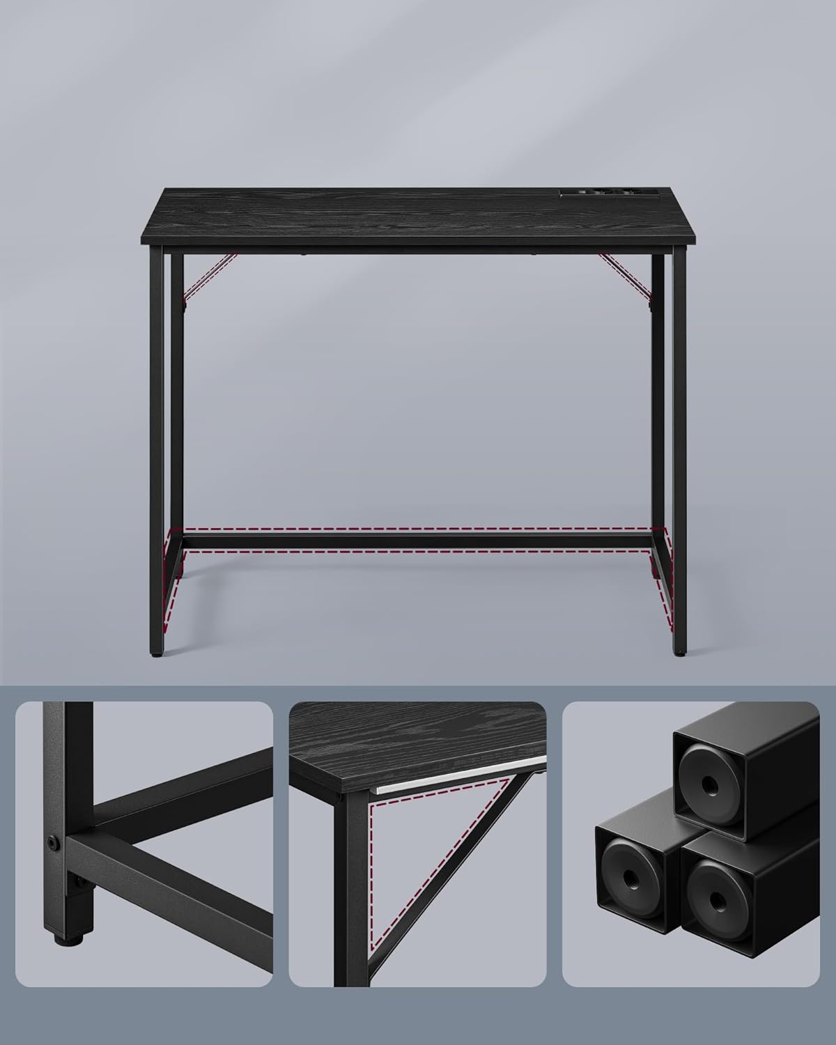 Structura din otel si blatul din lemn prelucrat ofera stabilitate foarte buna in utilizarea zilnica. Colturile metalice intarite si bara transversala contribuie la rezistenta, iar picioarele reglabile ajuta la mentinerea echilibrului chiar si pe pardoseli usor denivelate. In plus, dimensiunea de 100 x 50 cm il transforma intr-un birou pentru calculator eficient, care economiseste spatiu fara sa sacrifice confortul.