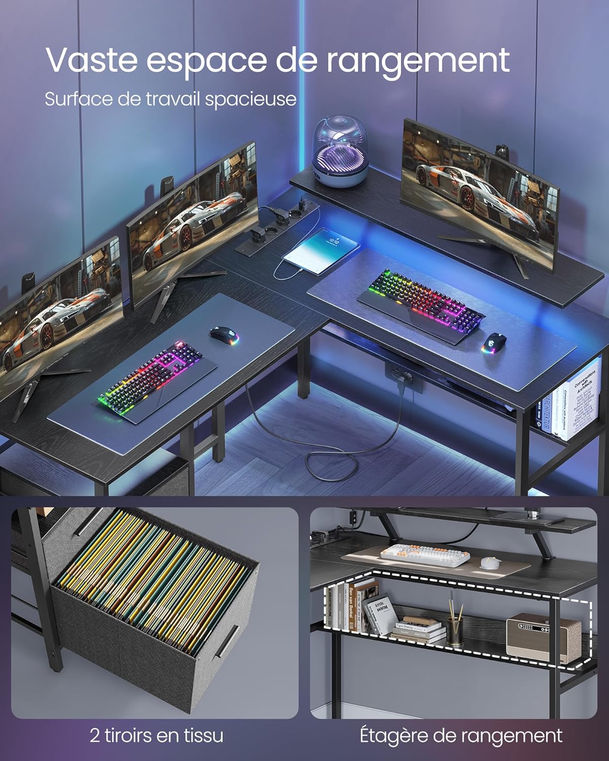 Birou in forma de L Vasagle cu LED, prize, USB si 2 sertare, negru