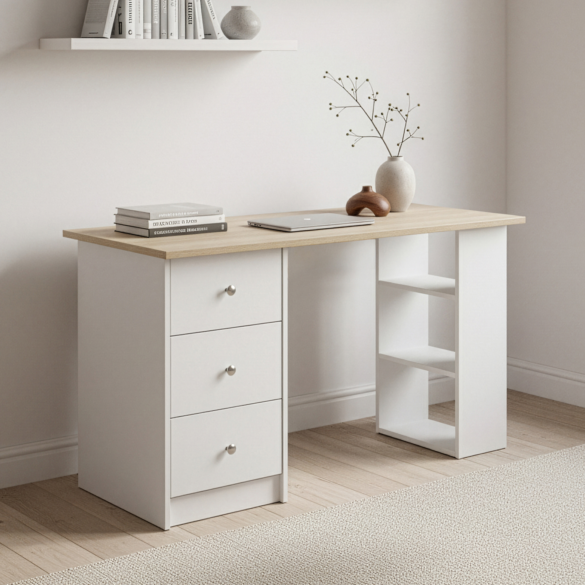 Acest birou cu sertare si rafturi este ideal pentru lucru la laptop, studiu, organizarea documentelor sau amenajarea unui colt de home office. In plus, corpurile inferioare pot fi montate pe partea dreapta sau stanga, pentru o adaptare mai usoara la spatiul disponibil.