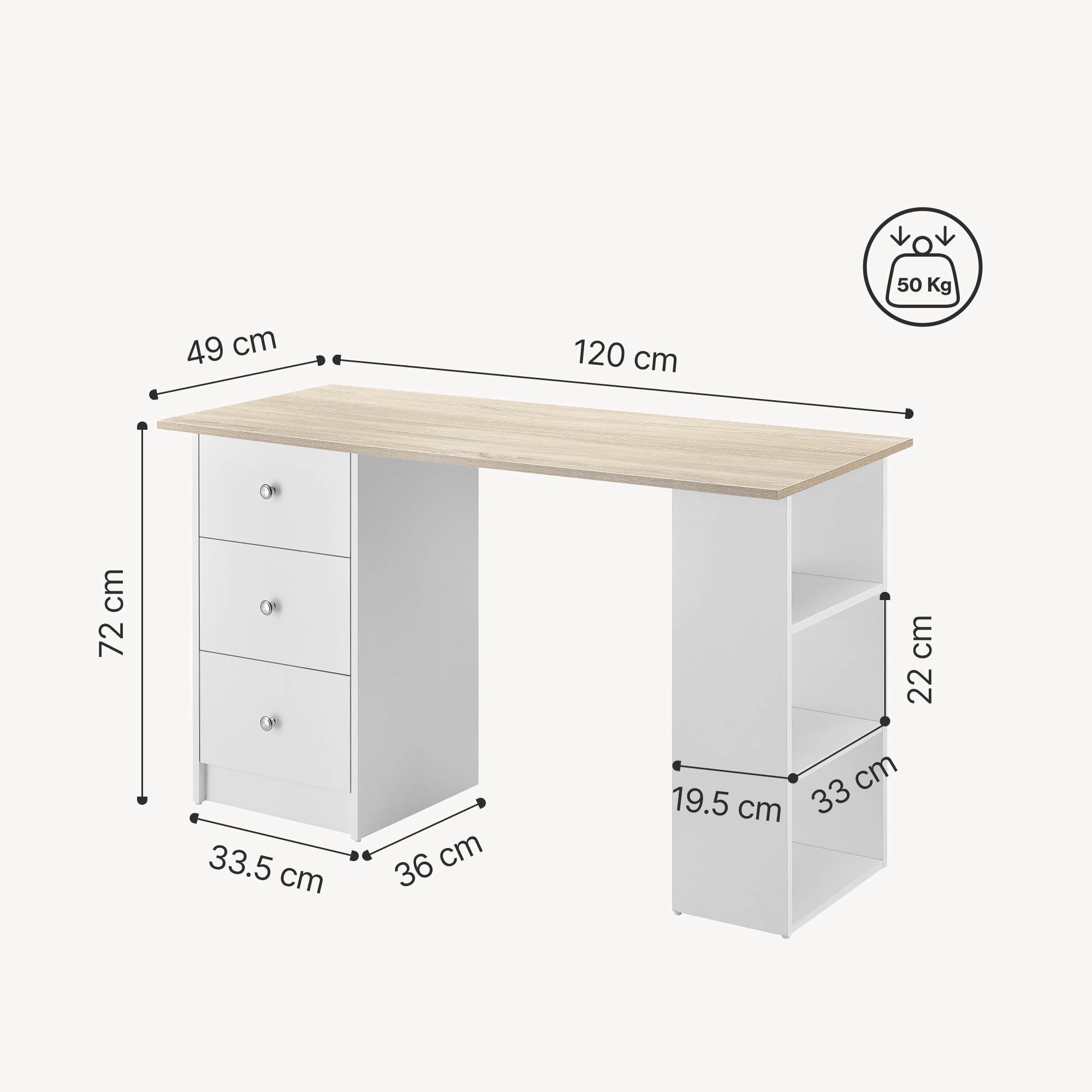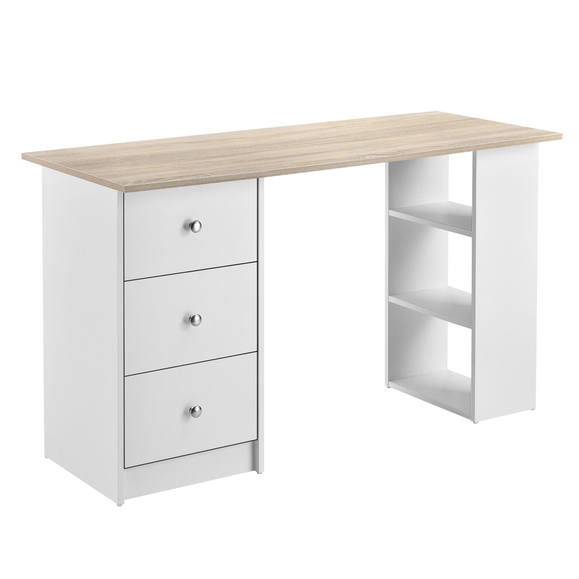Birou Lemberg 120x49x72 cm alb cu blat aspect stejar si 3 sertare