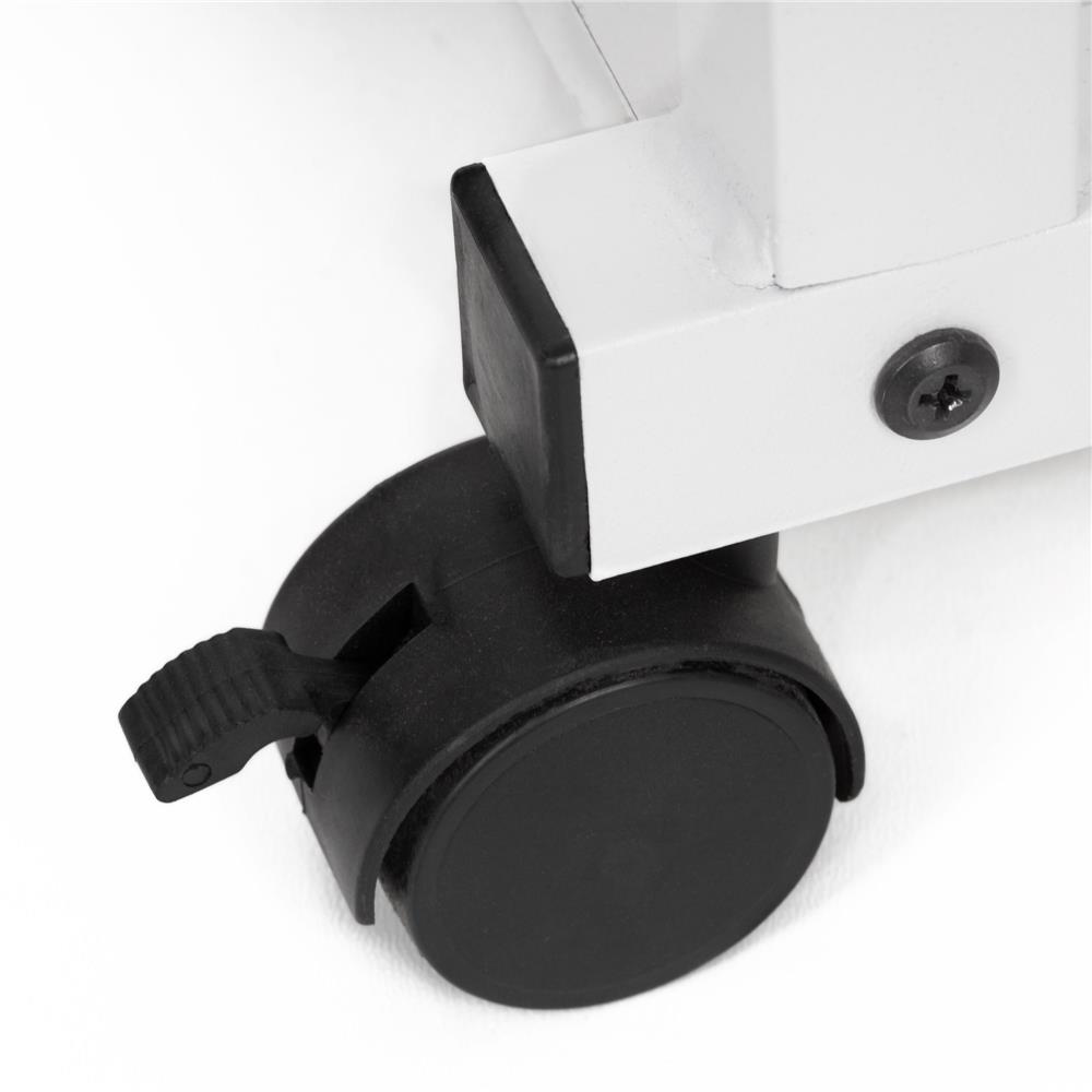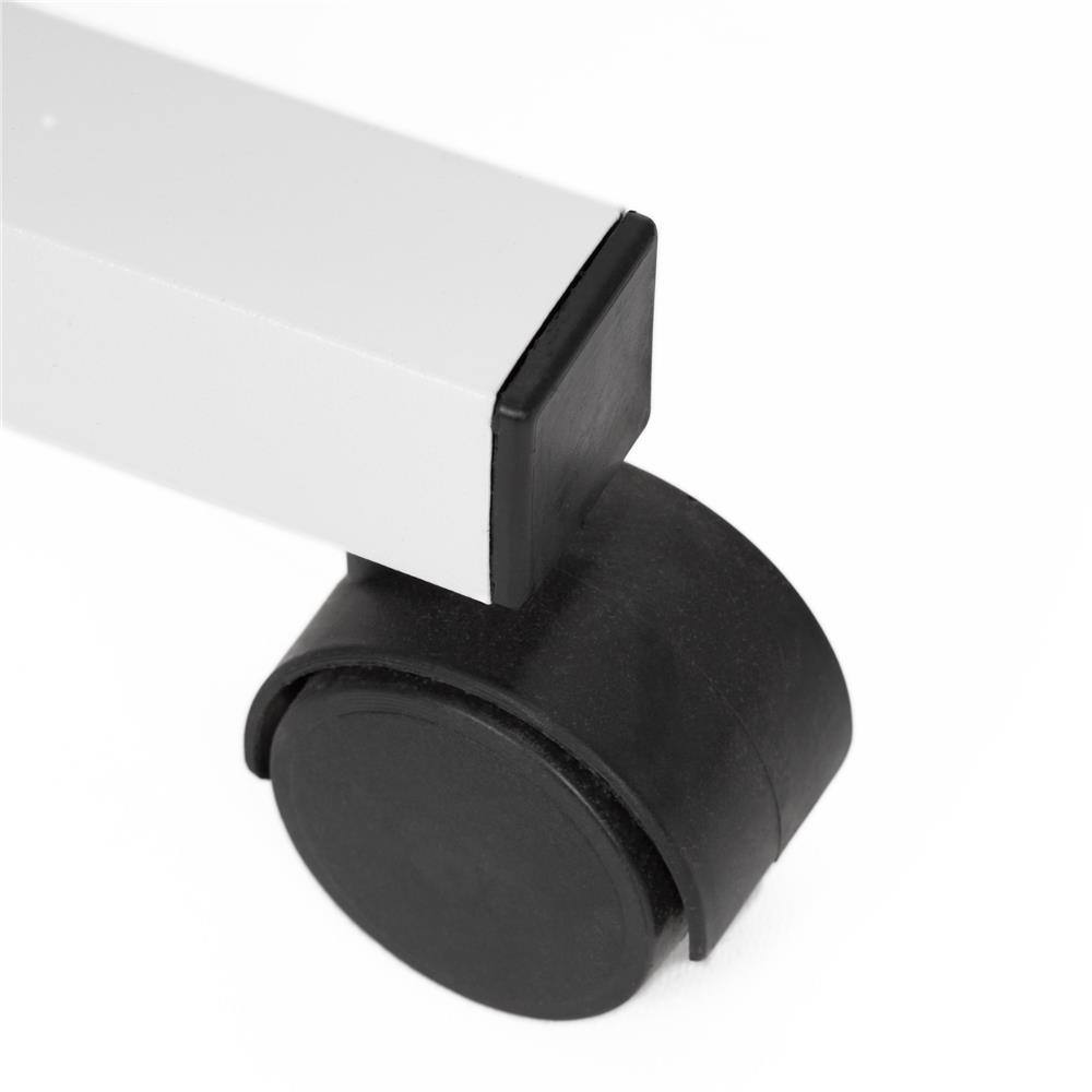 Reglarea manuala a inaltimii iti permite sa adaptezi biroul in functie de activitate si confort, iar rafturile laterale sunt utile pentru depozitarea accesoriilor, documentelor sau obiectelor folosite frecvent. Rotile pivotante ajuta la deplasarea usoara, iar doua dintre ele au sistem de blocare pentru o pozitionare sigura.