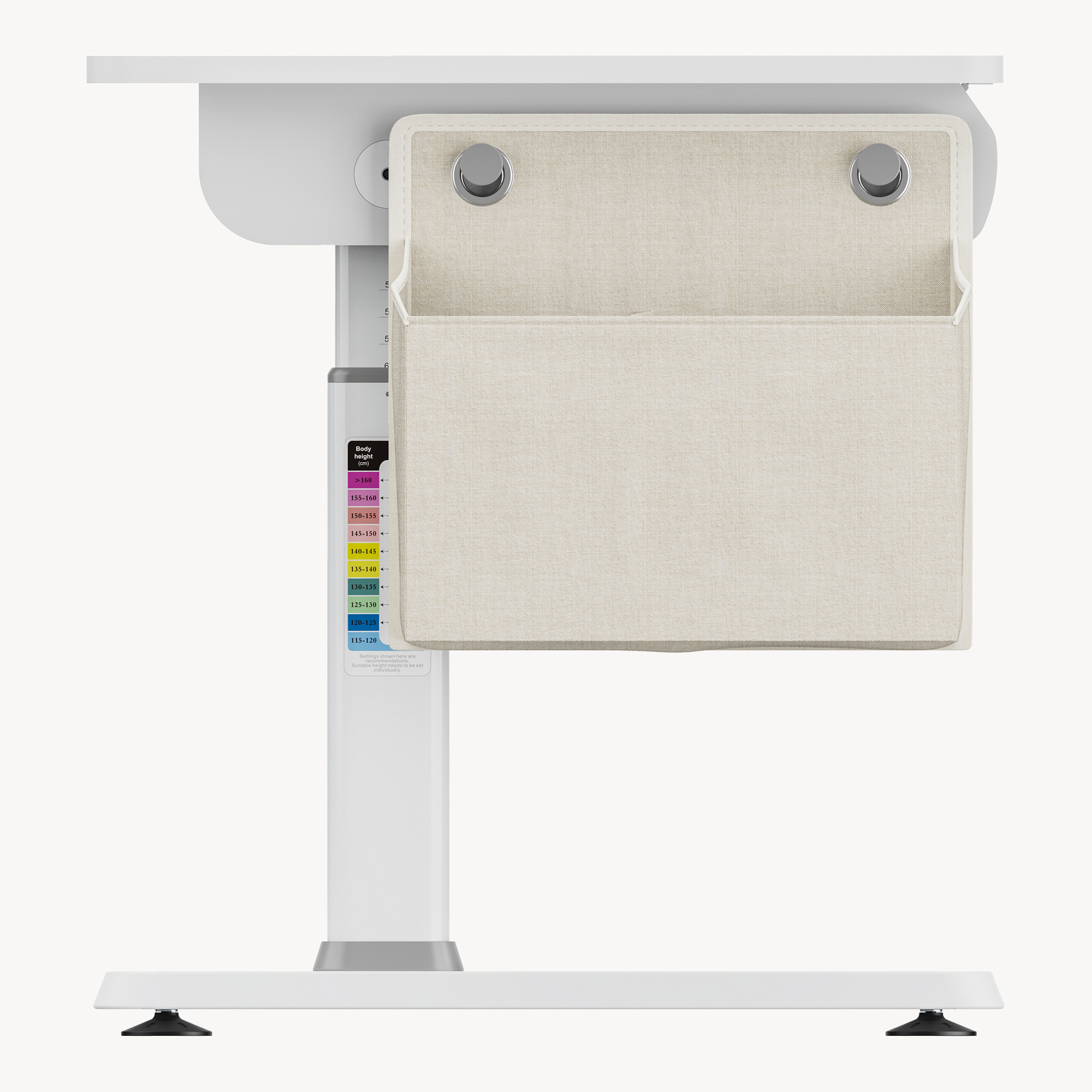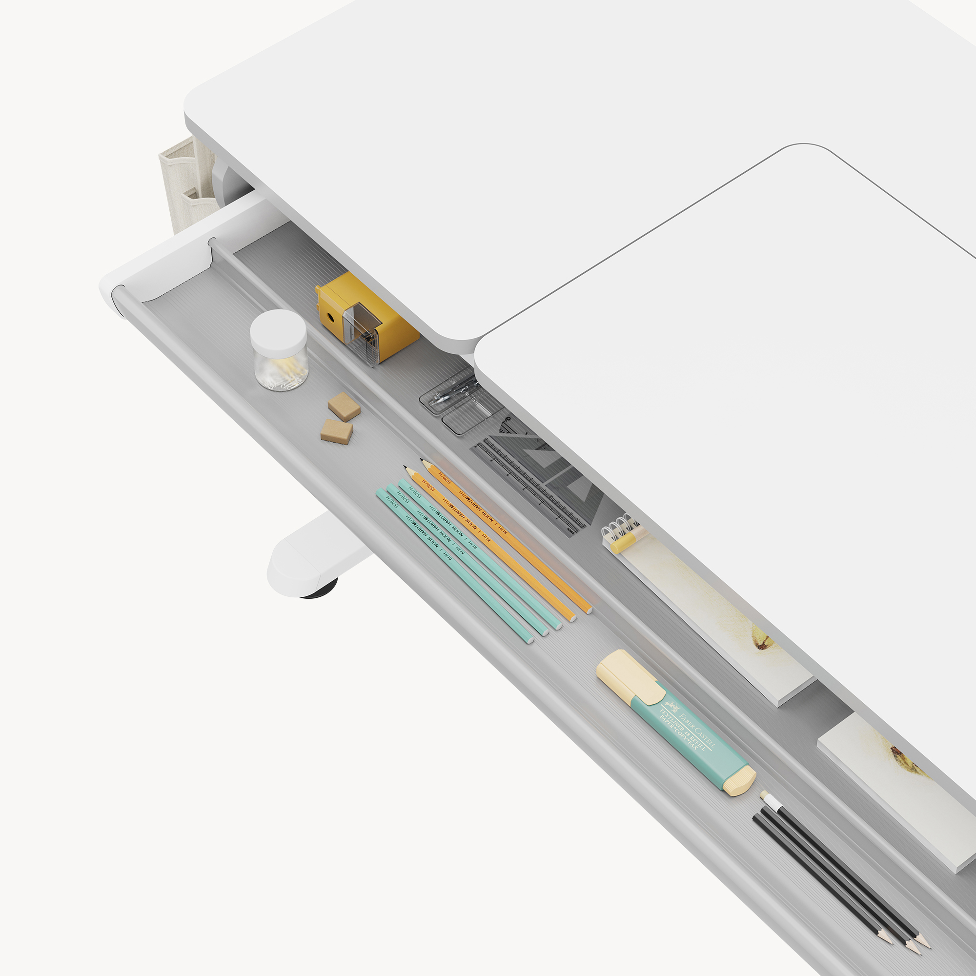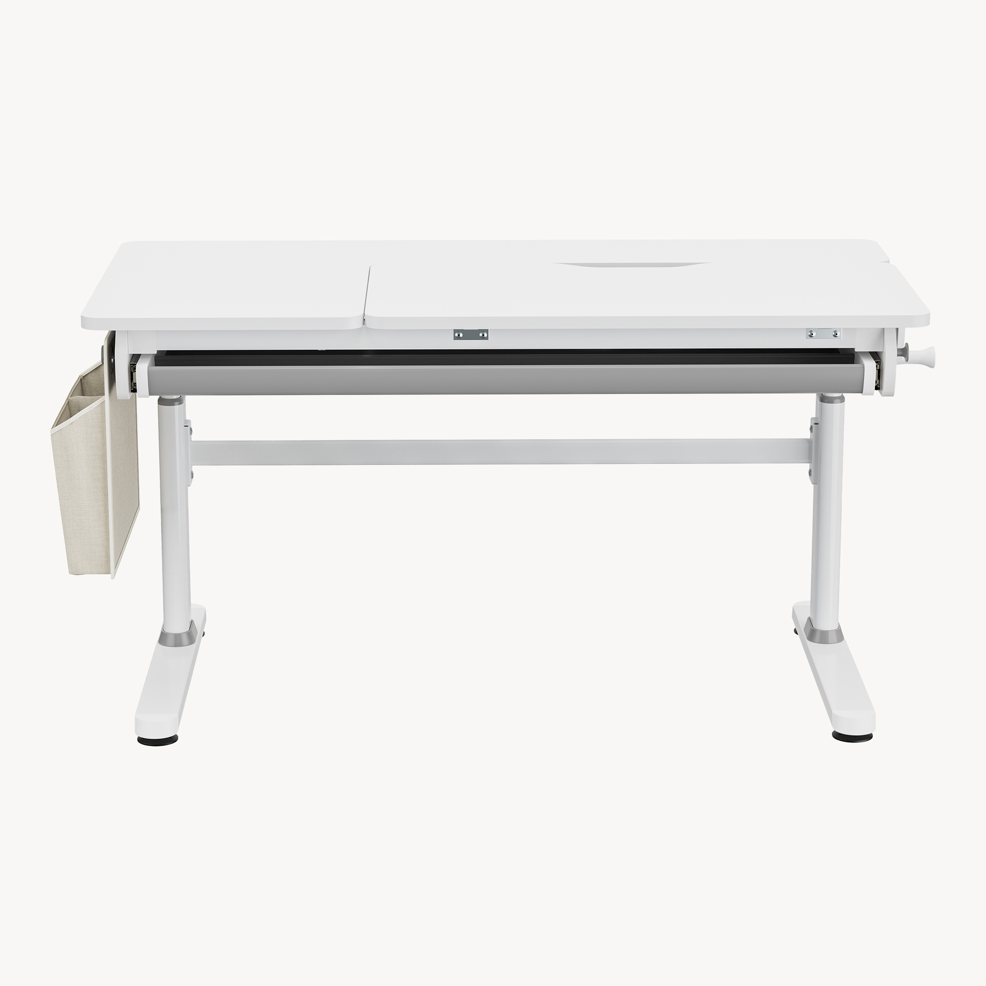 Sub blat se află o tavă glisantă practică pentru depozitarea instrumentelor de scris, iar geanta textilă inclusă, cu două compartimente, oferă loc suplimentar pentru cărți, caiete sau accesorii. Cele două cârlige laterale pot fi folosite atât pentru geantă, cât și pentru ghiozdan sau alte genți.