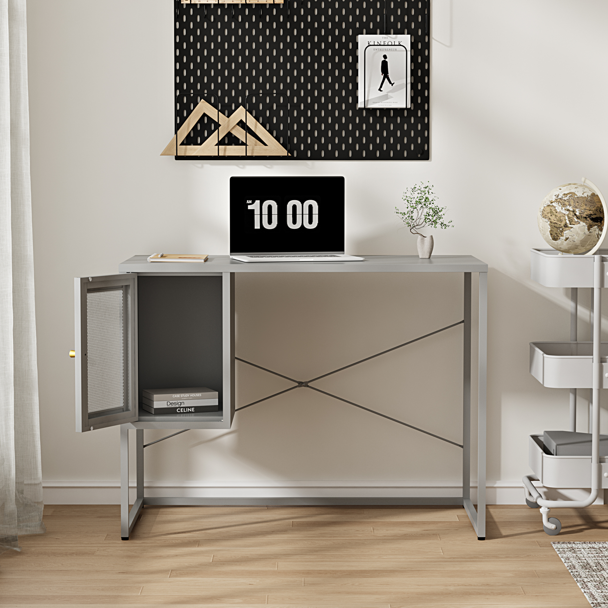Blatul generos oferă suficient loc pentru laptop, monitor, caiete, accesorii de birou și alte obiecte esențiale. În plus, compartimentul lateral de depozitare, prevăzut cu ușă din plasă metalică fină și mâner, este ideal pentru cărți, dosare sau obiecte pe care vrei să le ai la îndemână, dar bine organizate.