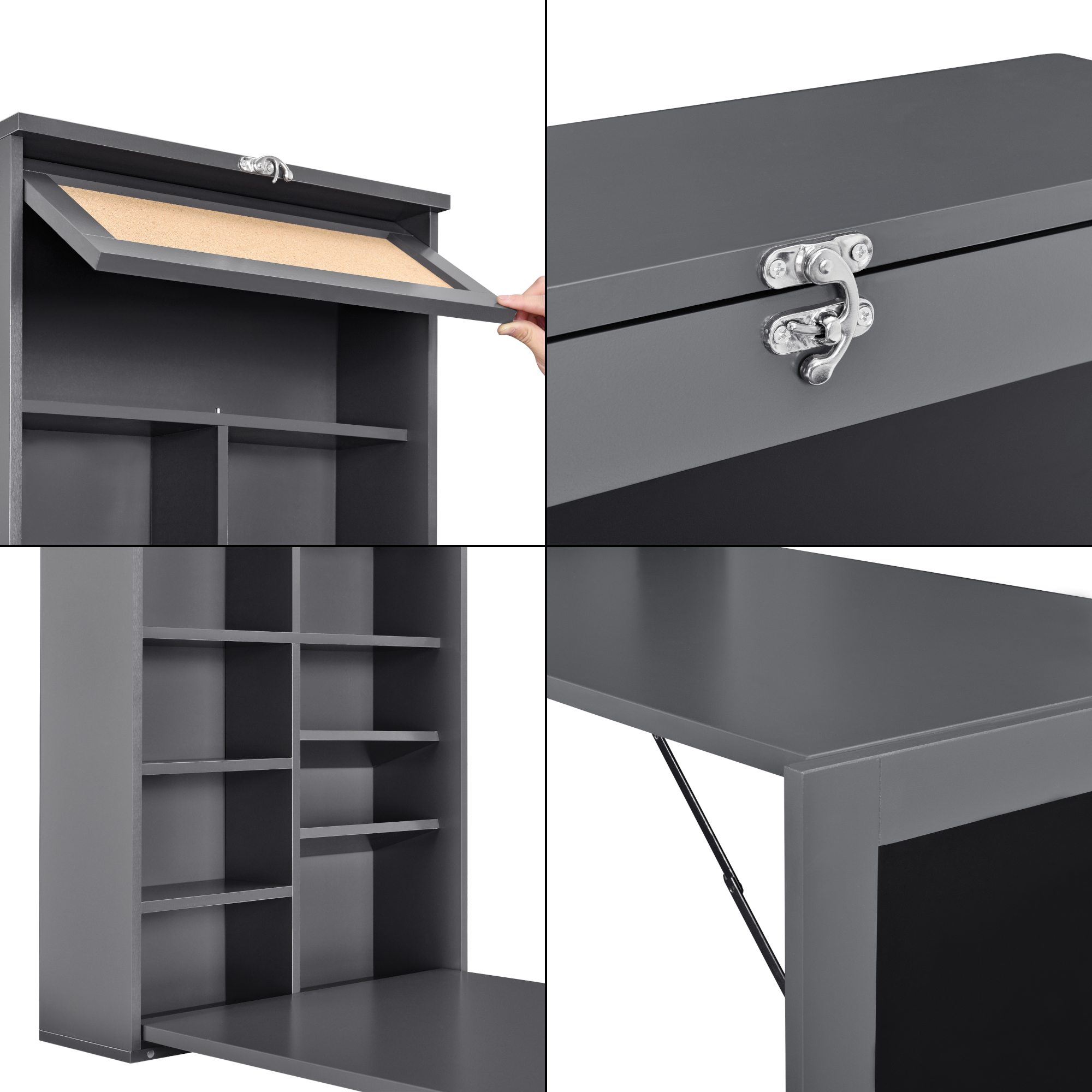 Birou suspendat pliabil de perete cu rafturi și tablă, gri închis