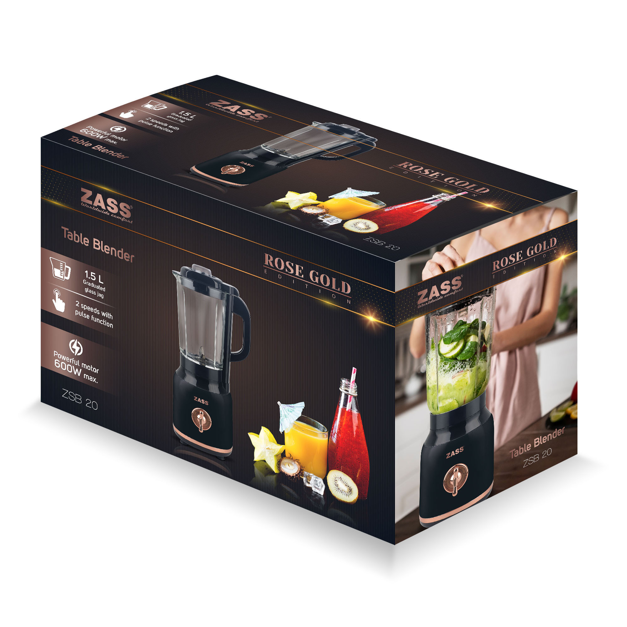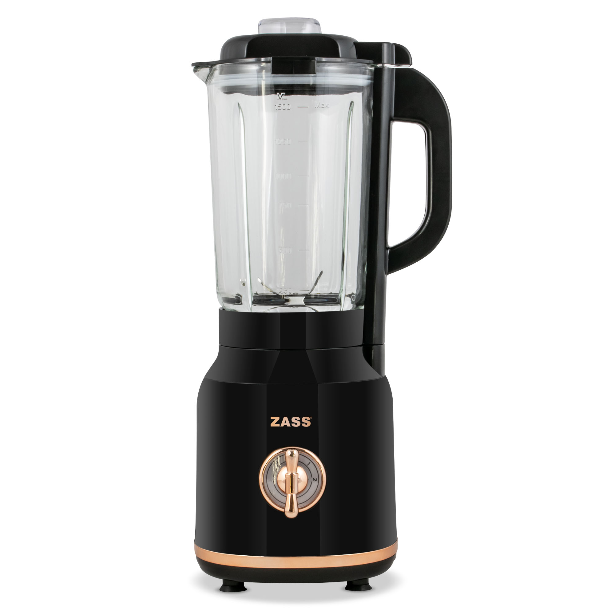 Pregătește rapid băuturi și rețete delicioase cu blenderul de masă ZASS ZSB 20, un ajutor practic pentru orice bucătărie. Cu un motor de 600W, cană gradată din sticlă de 1,5 litri și lame rezistente din inox, acest blender de bucătărie este ideal pentru smoothie-uri, shake-uri, supe cremă, sosuri și chiar pentru zdrobirea gheții. Designul elegant, în nuanțe negre cu accente rose gold, îl face ușor de integrat în orice decor.
